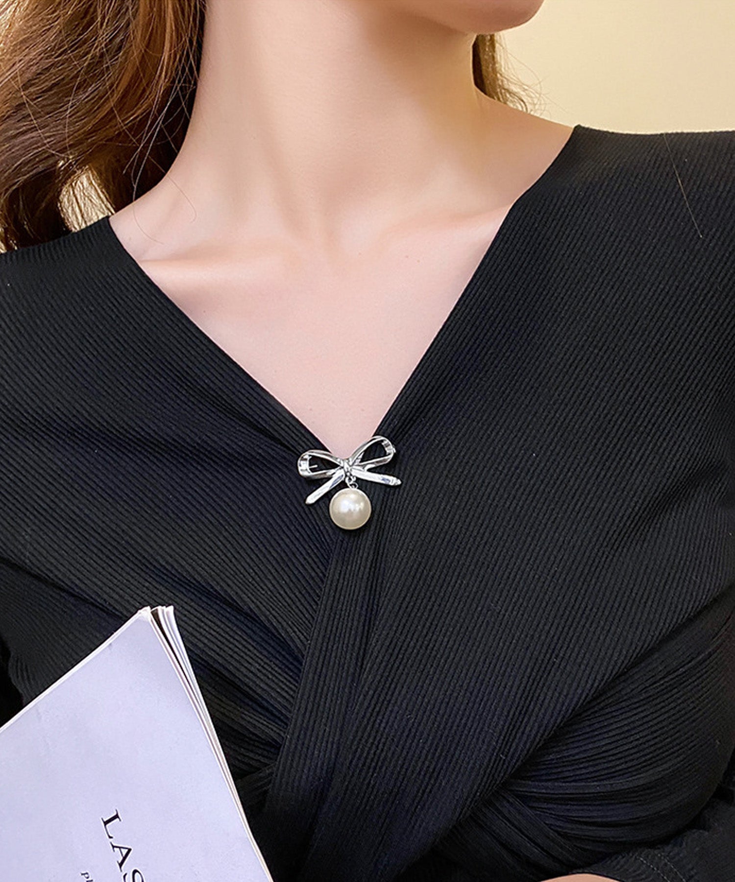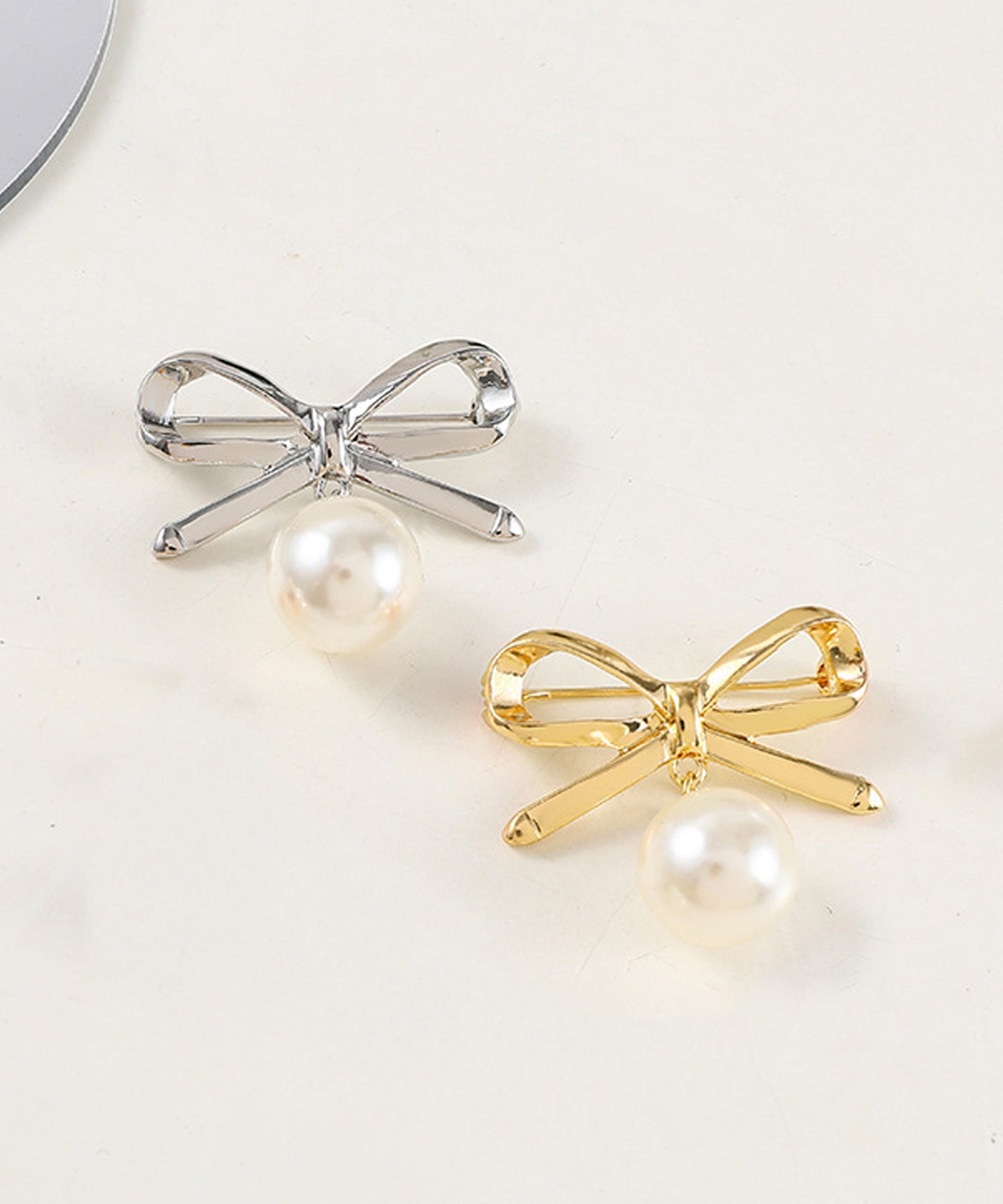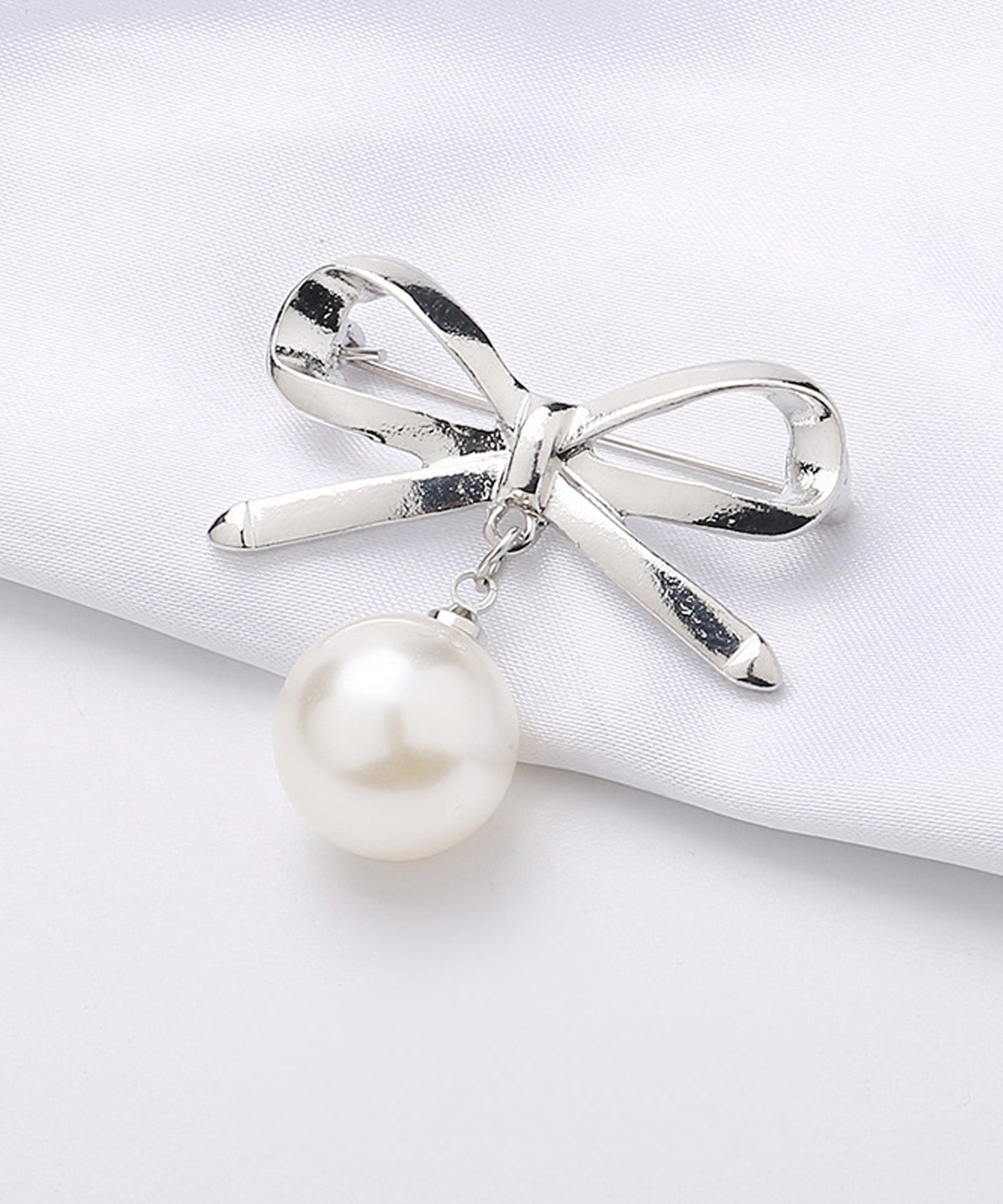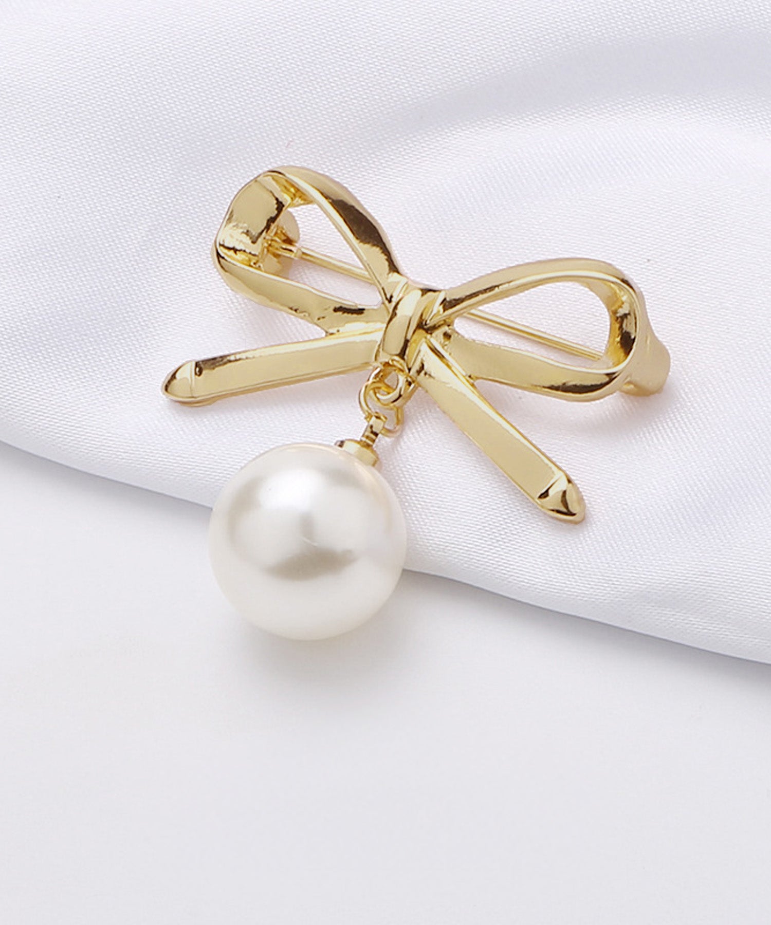 シンプルなリボンモチーフに、大粒の揺れるパールがアクセントになった上品で華やかなブローチです。