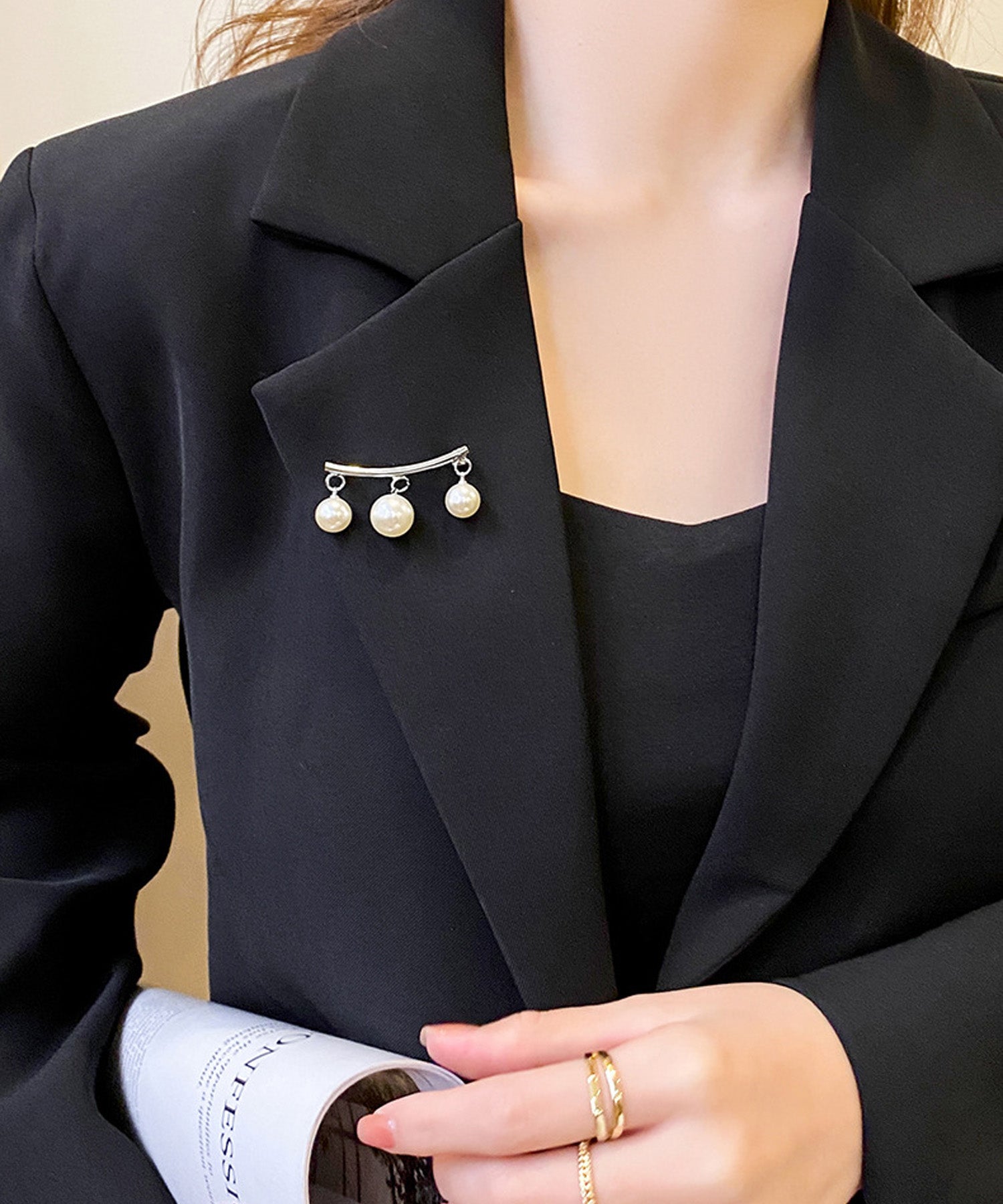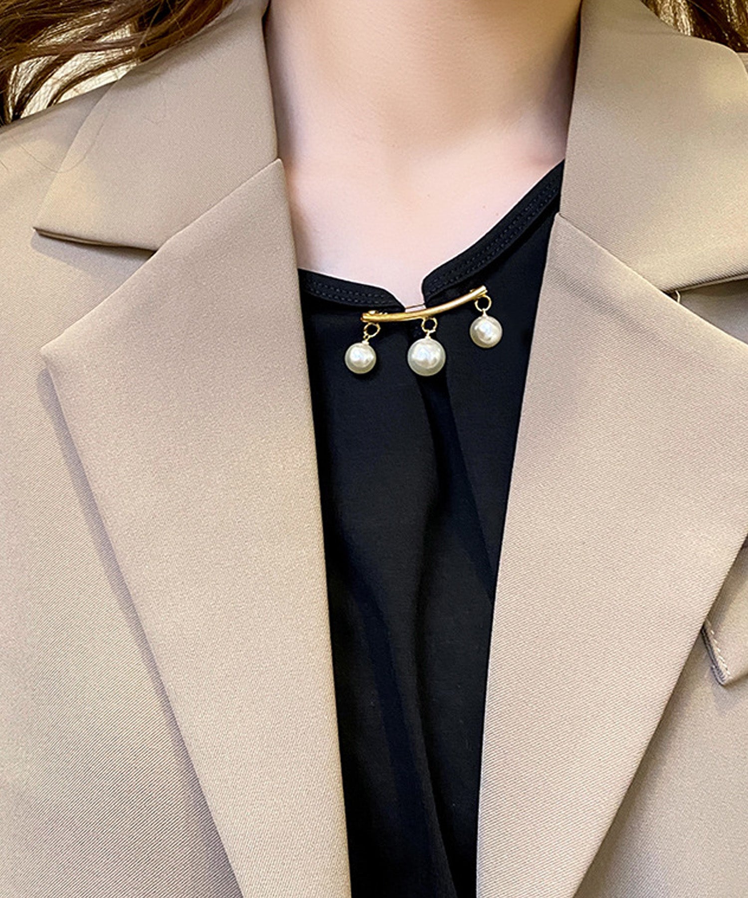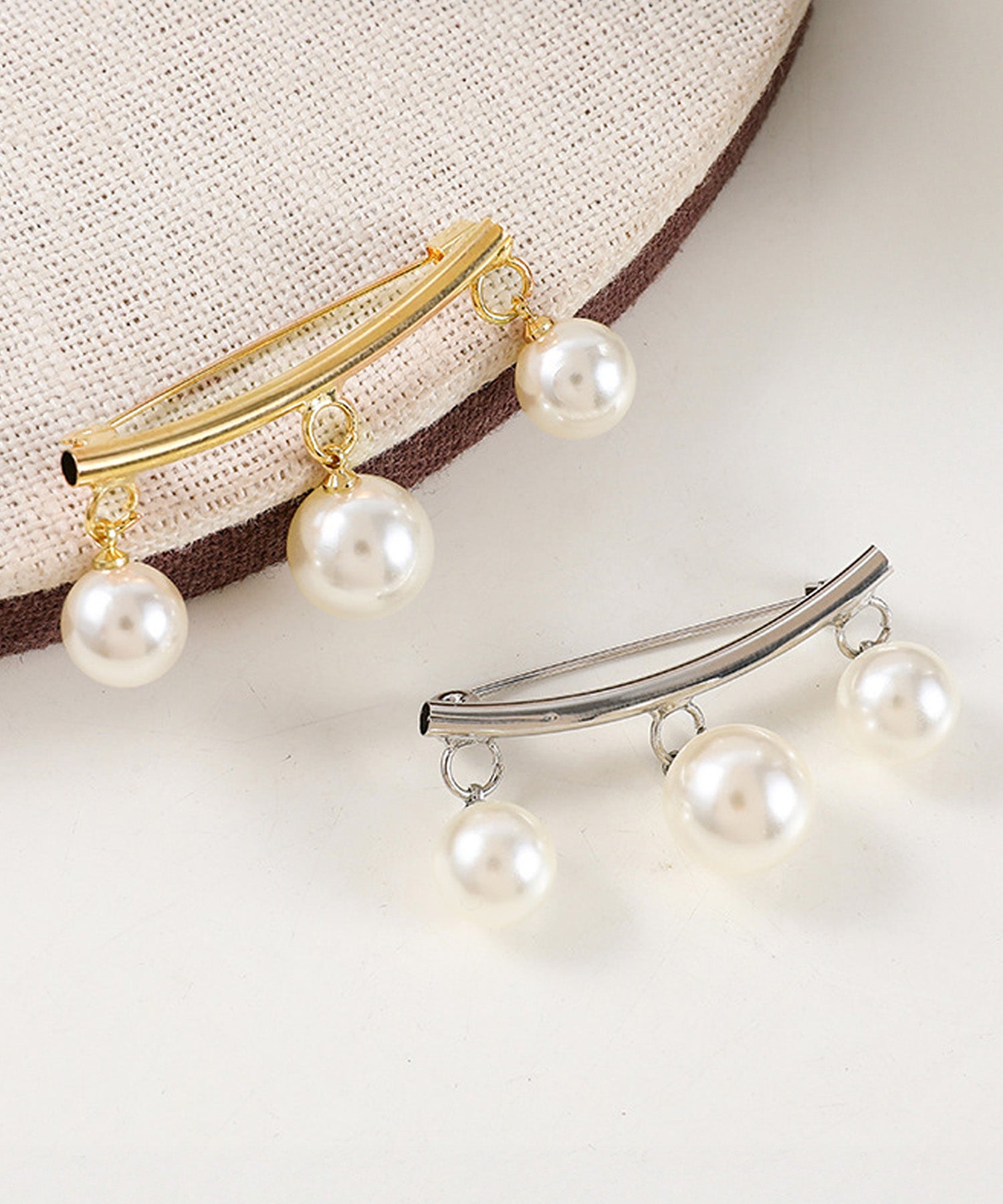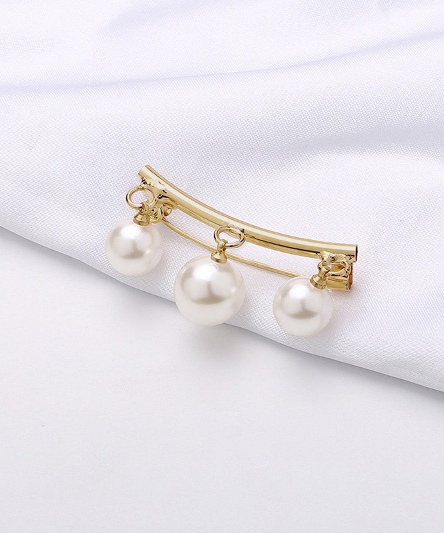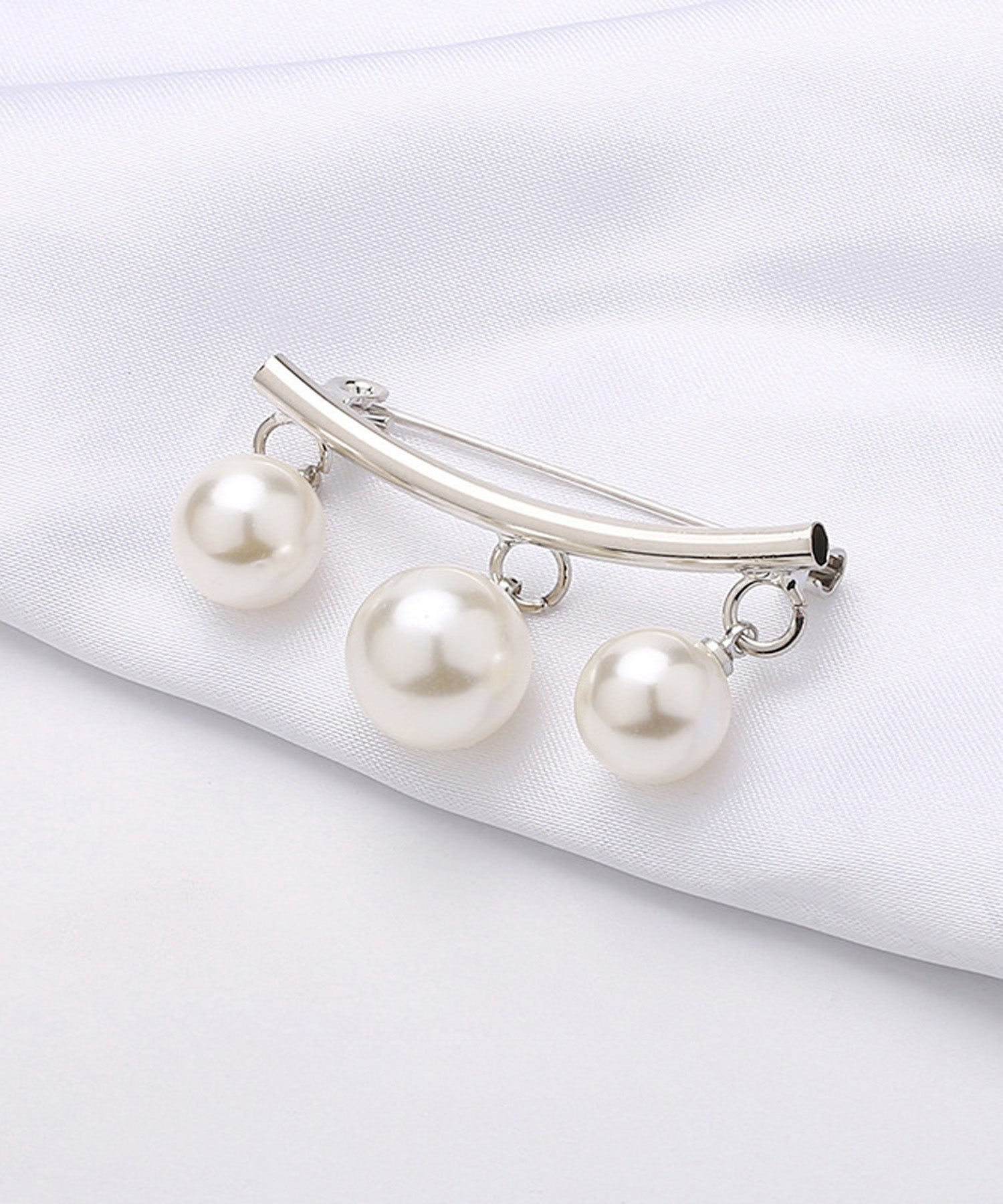 湾曲したバーに3粒のパールが吊り下げられた、シンプルながらも上品なブローチです。