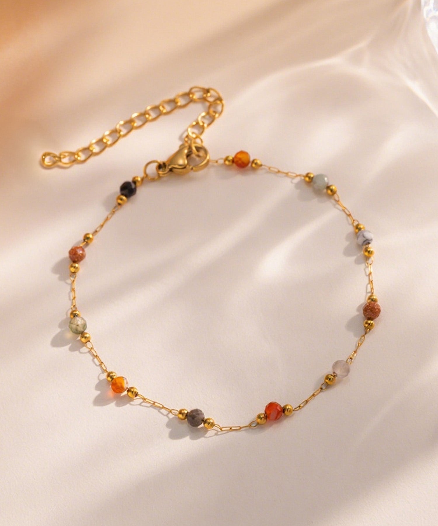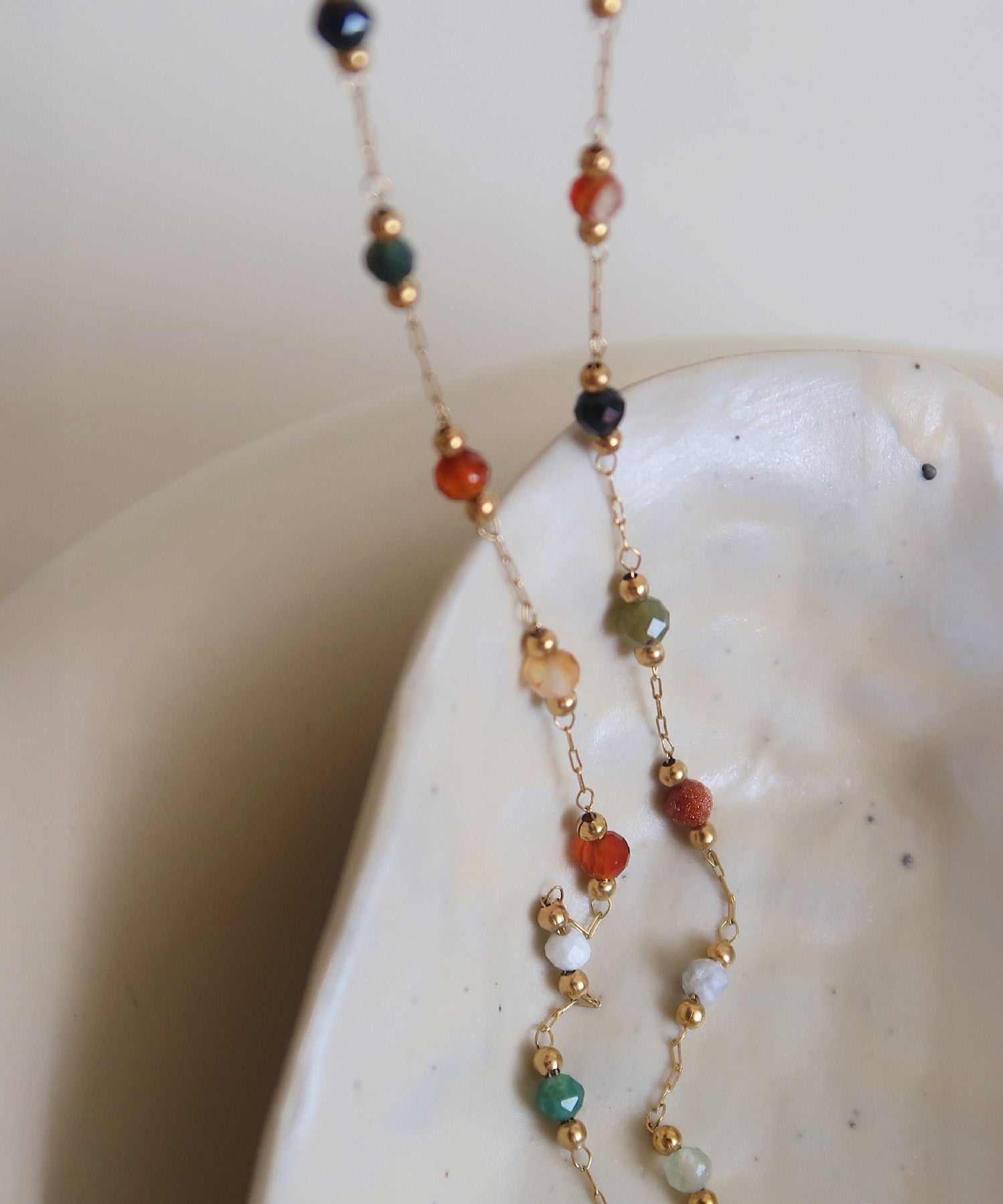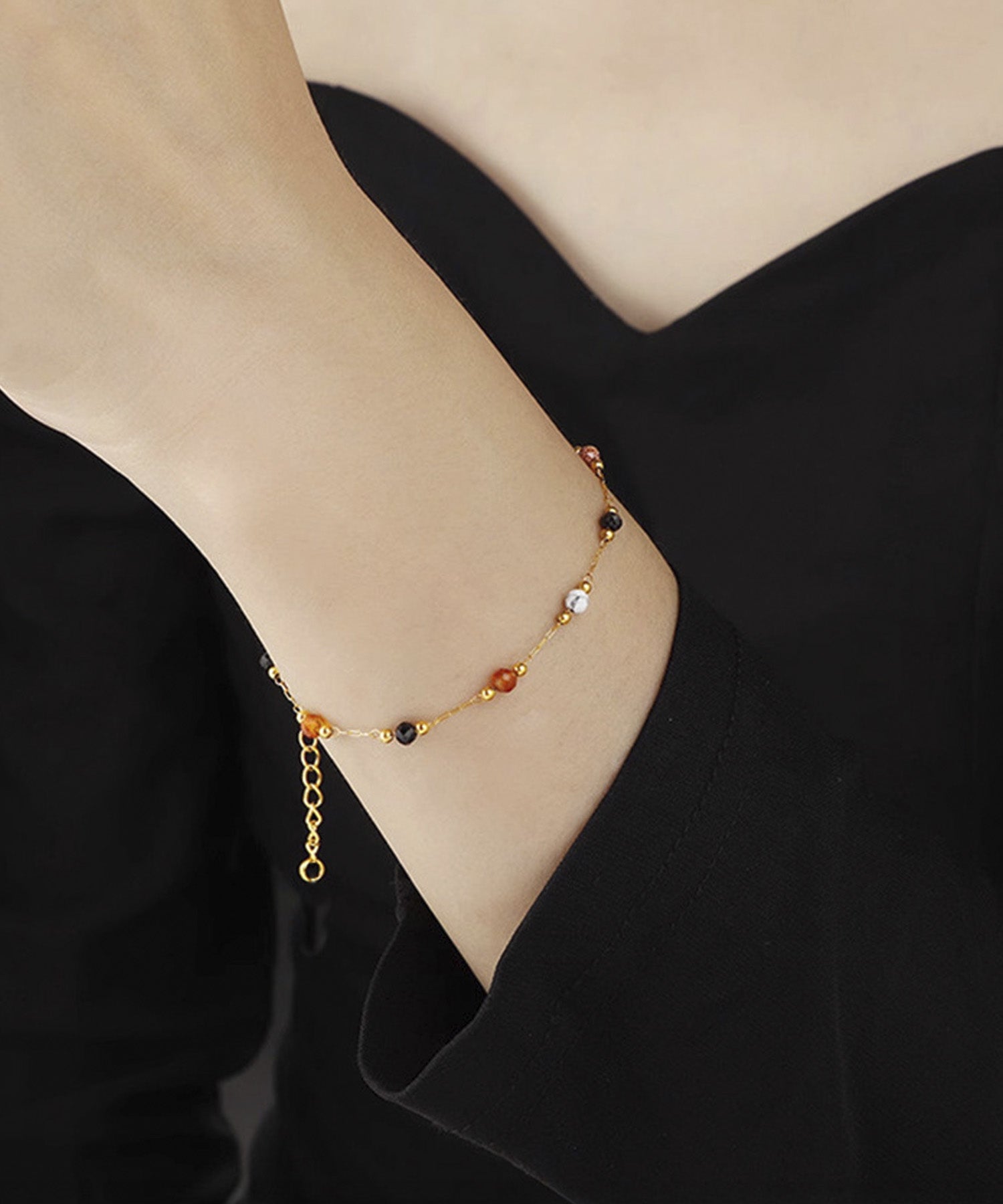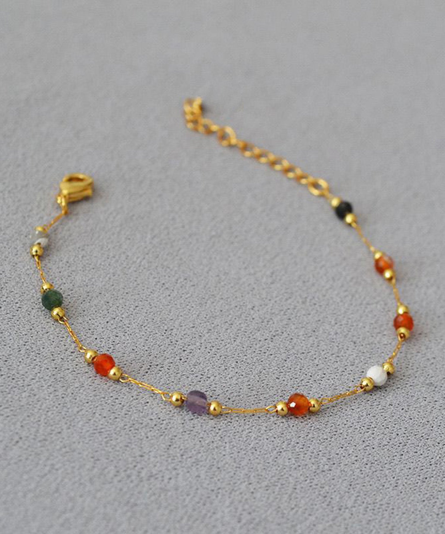 マルチカラーの天然石が並んでいるシンプルながらも存在感があるブレスレット。