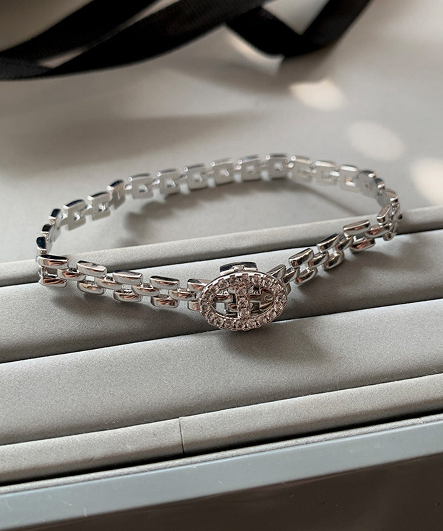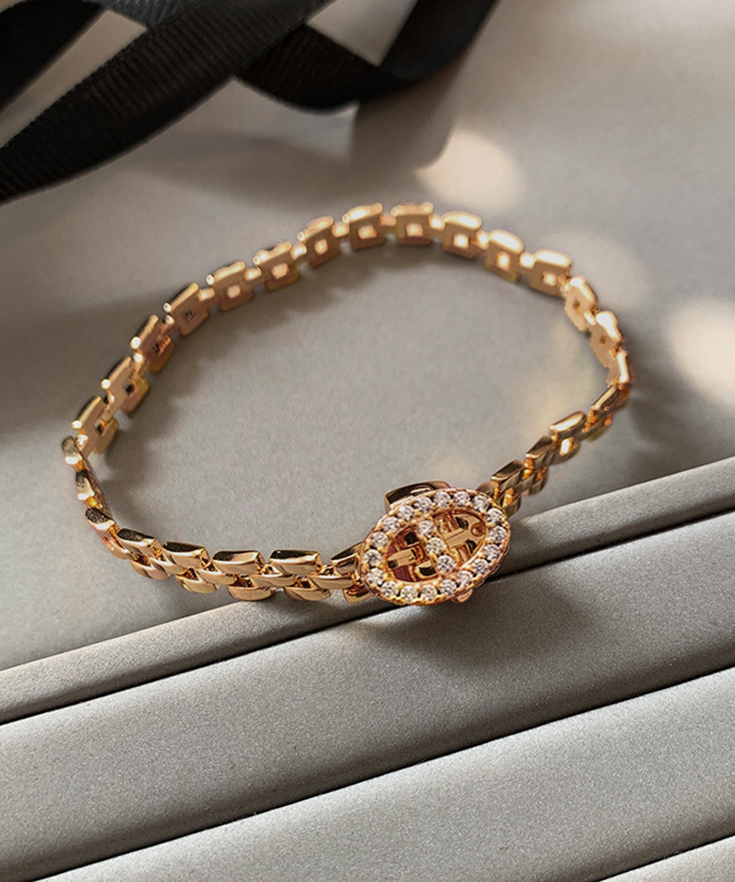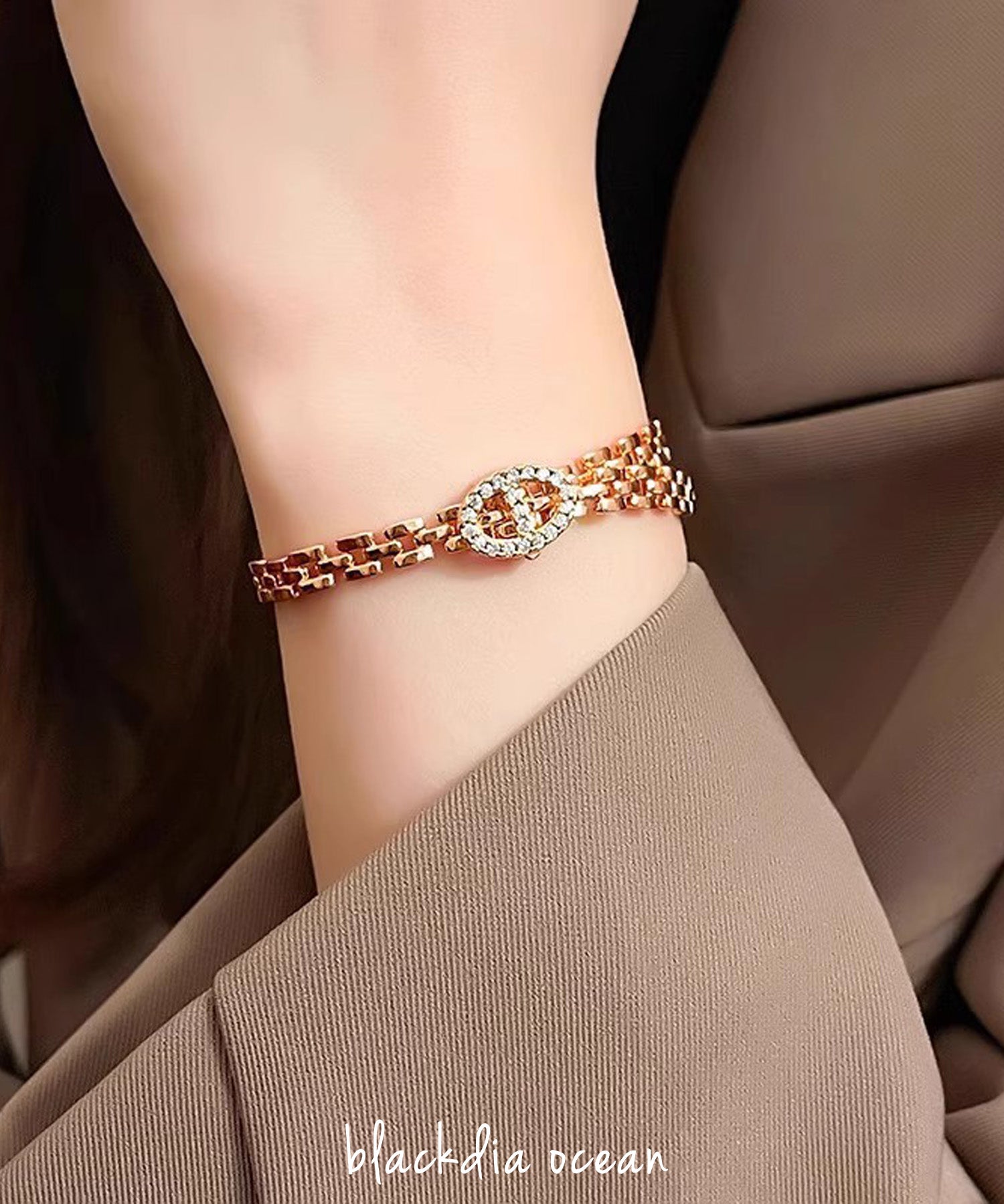 オーバルのバックルにはジルコニアが贅沢にあしらわれ、手元を華やかに演出します。