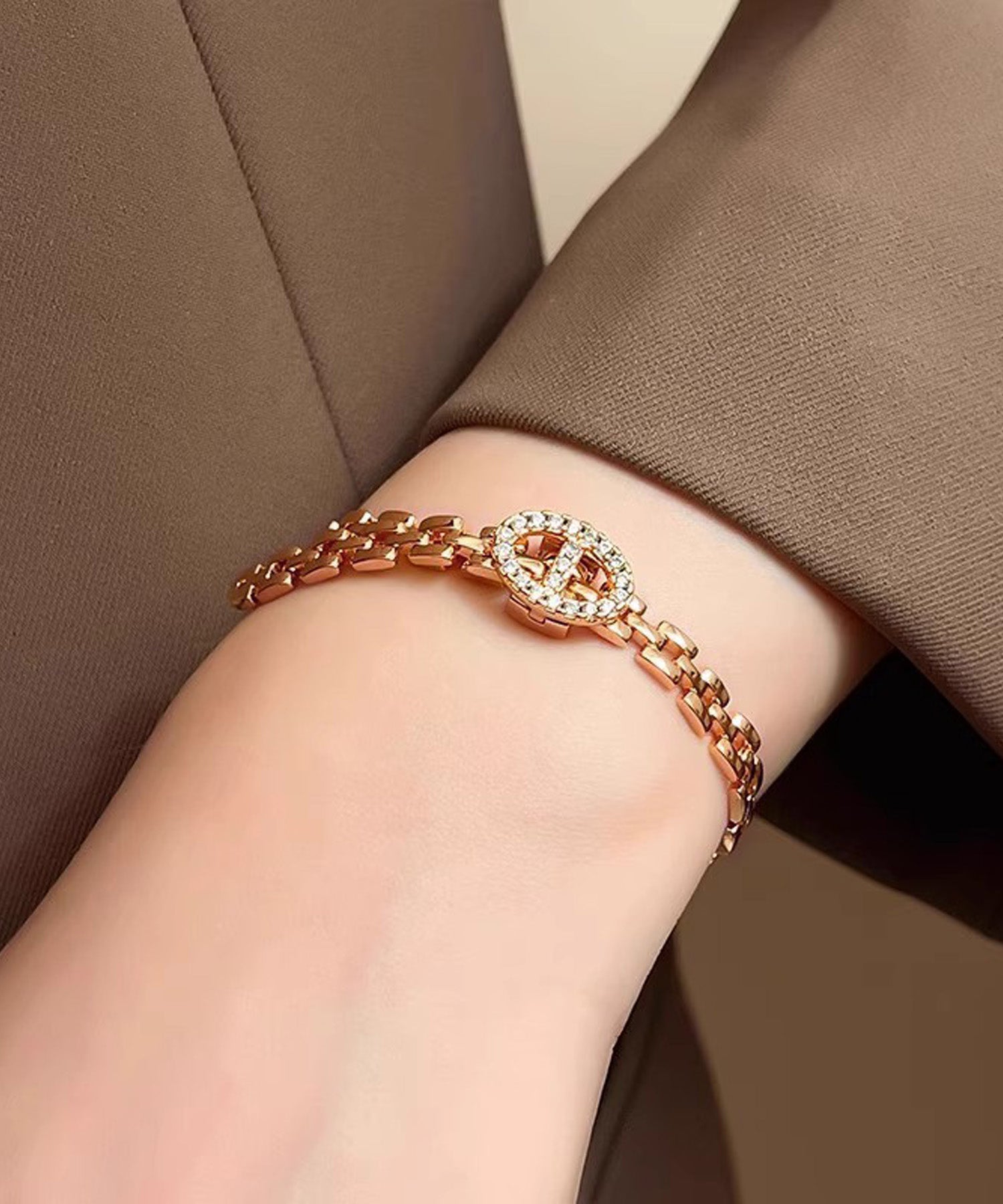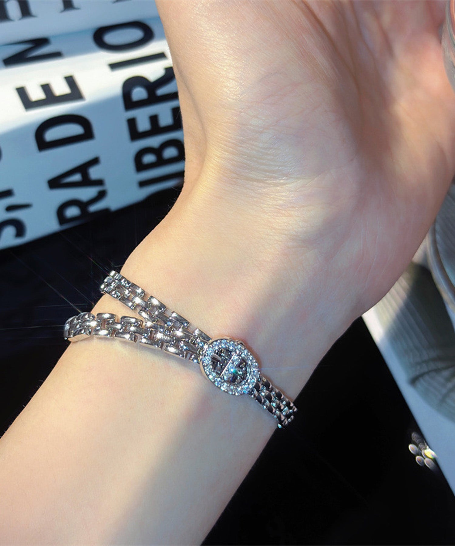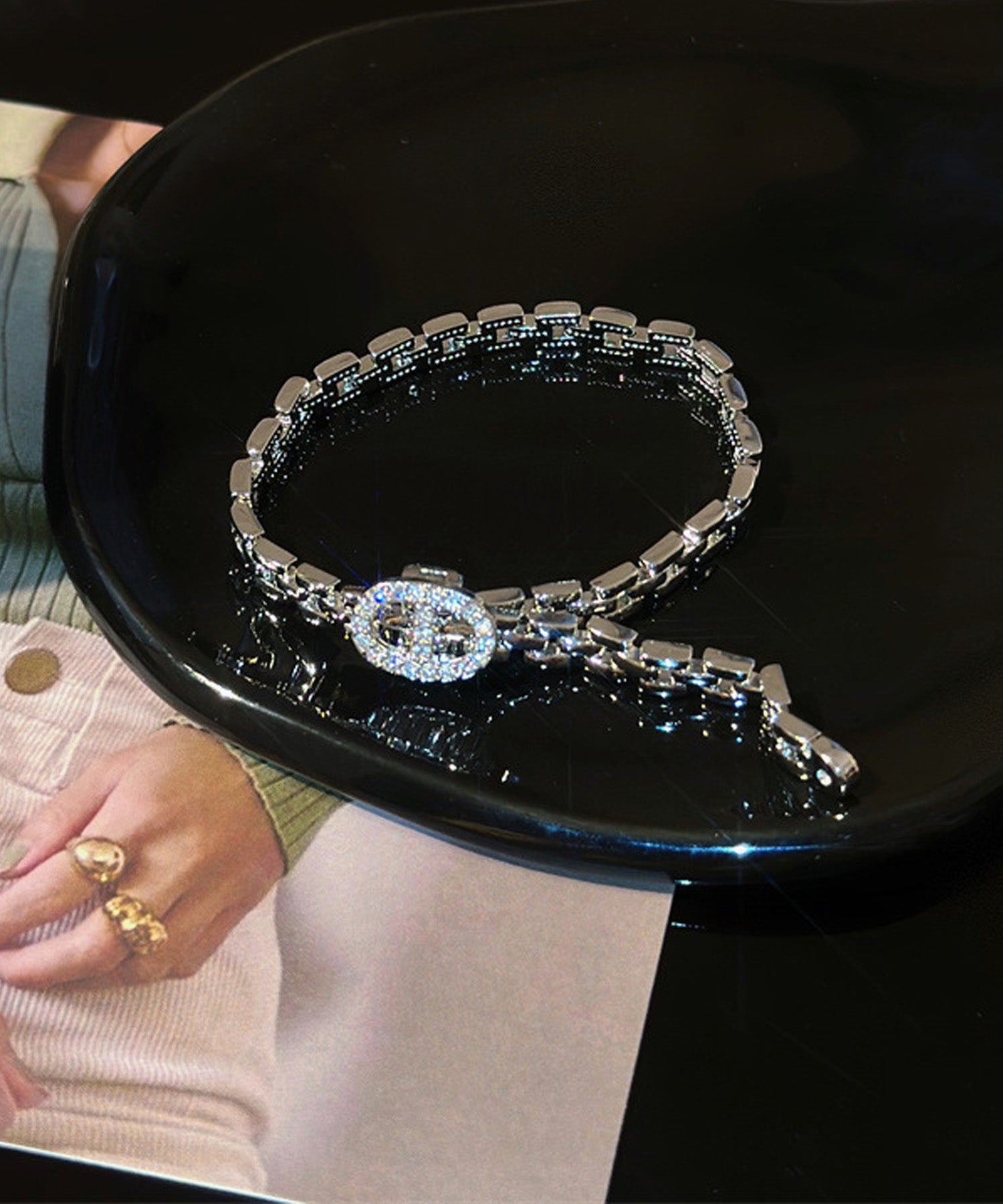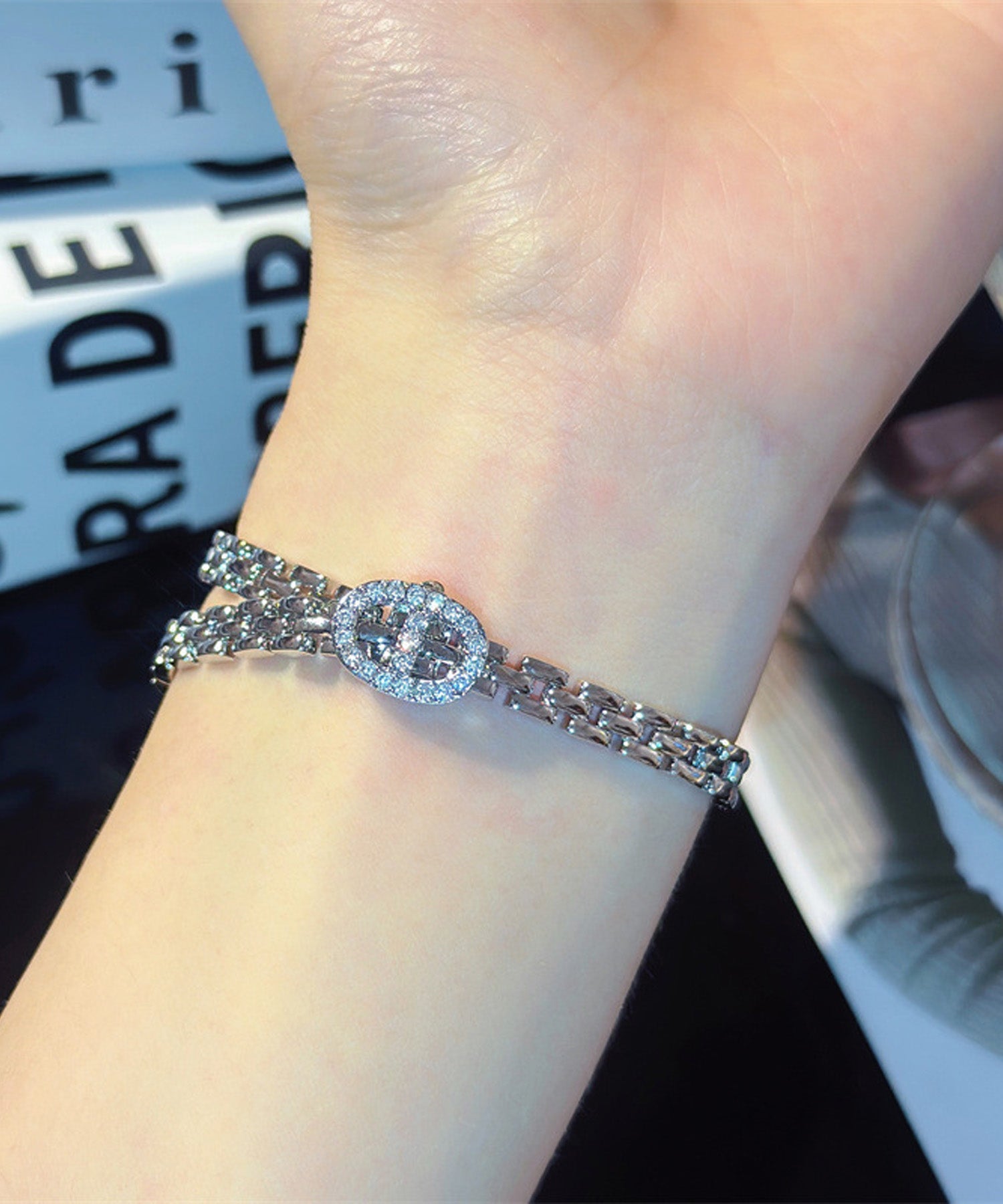オーバルのバックルにはジルコニアが贅沢にあしらわれ、手元を華やかに演出します。