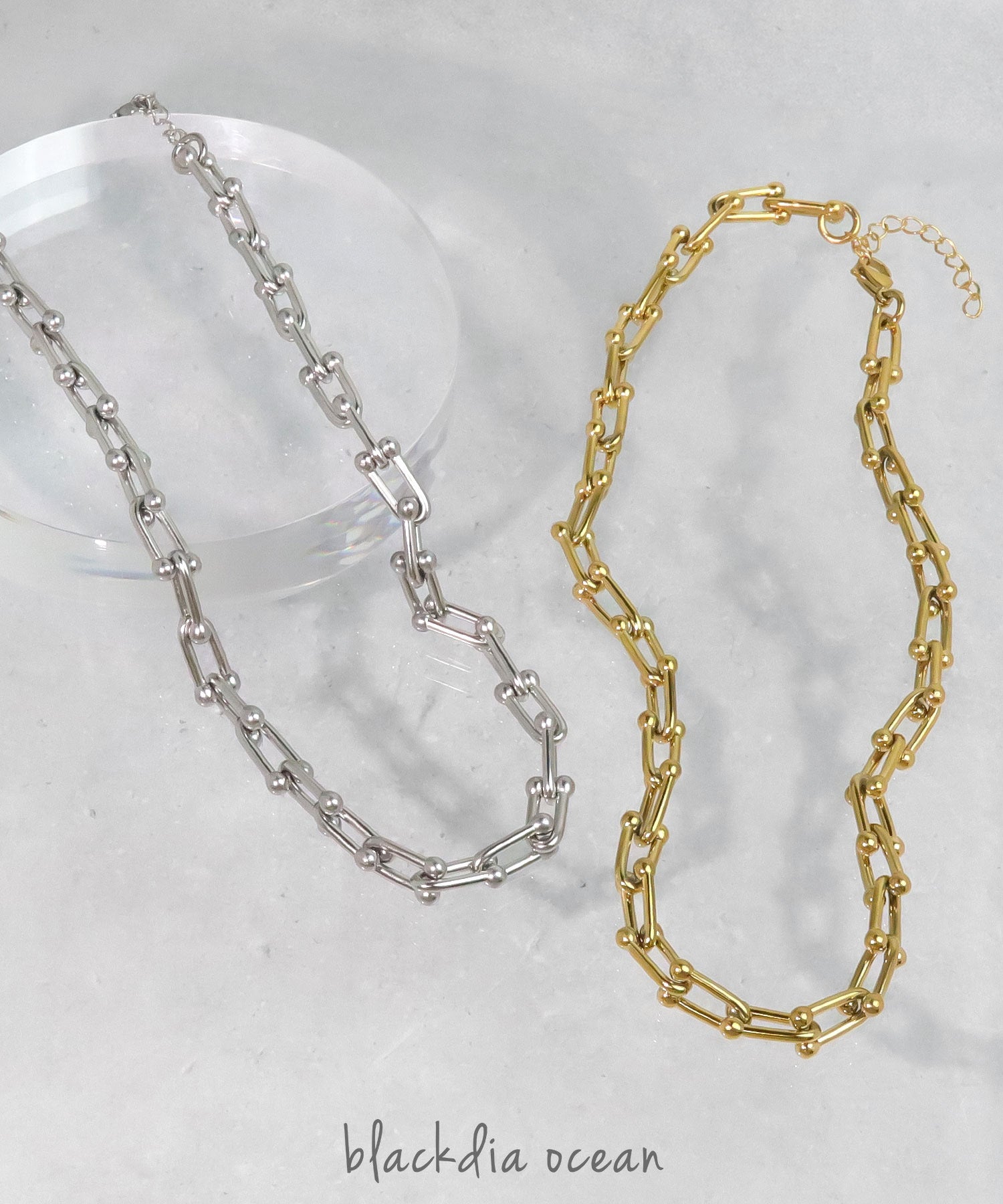 U字型の馬蹄モチーフ、両サイドはオーバルチェーンがリンクされたデザインが程よい存在感のホースシューチェーンネックレス。