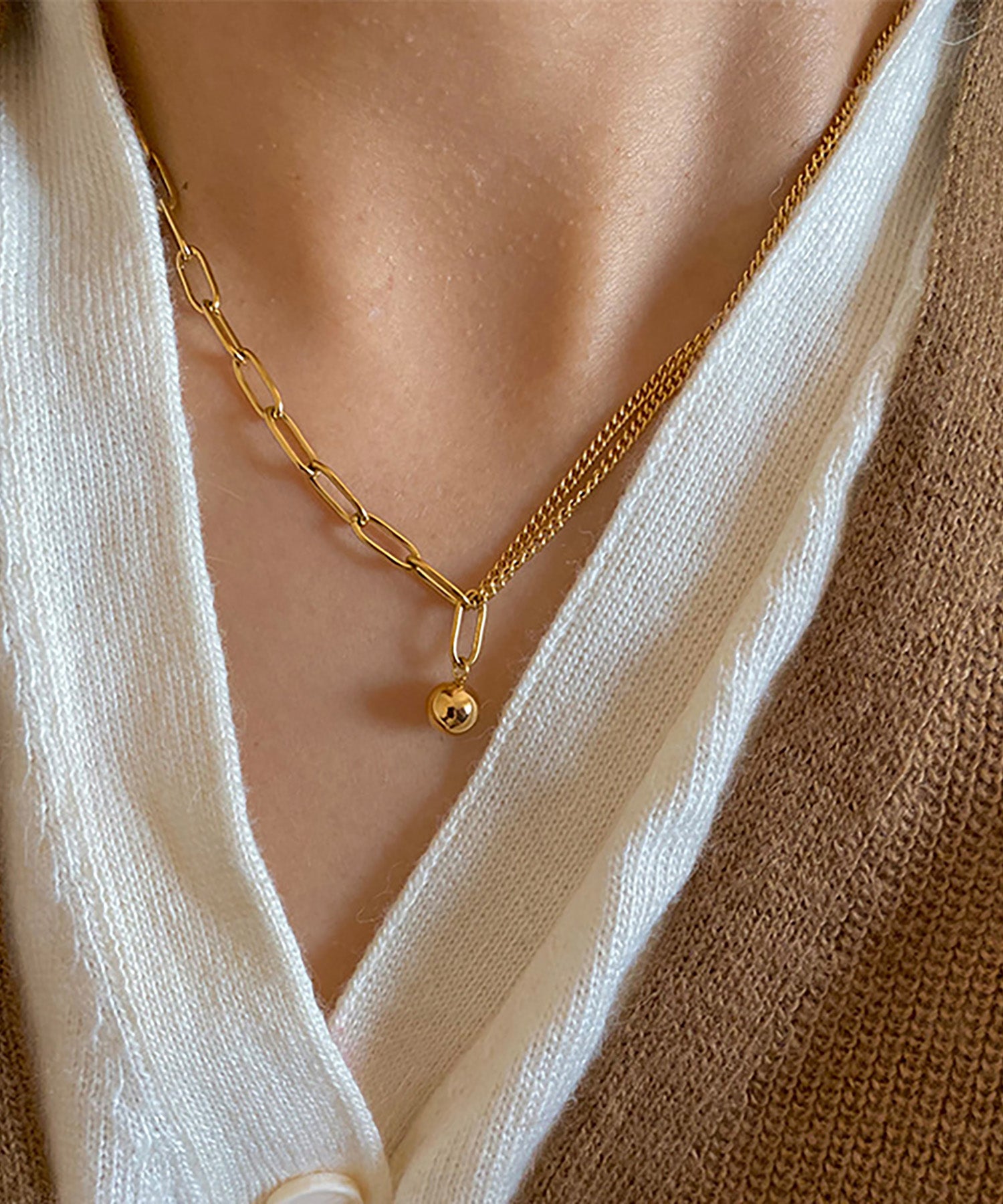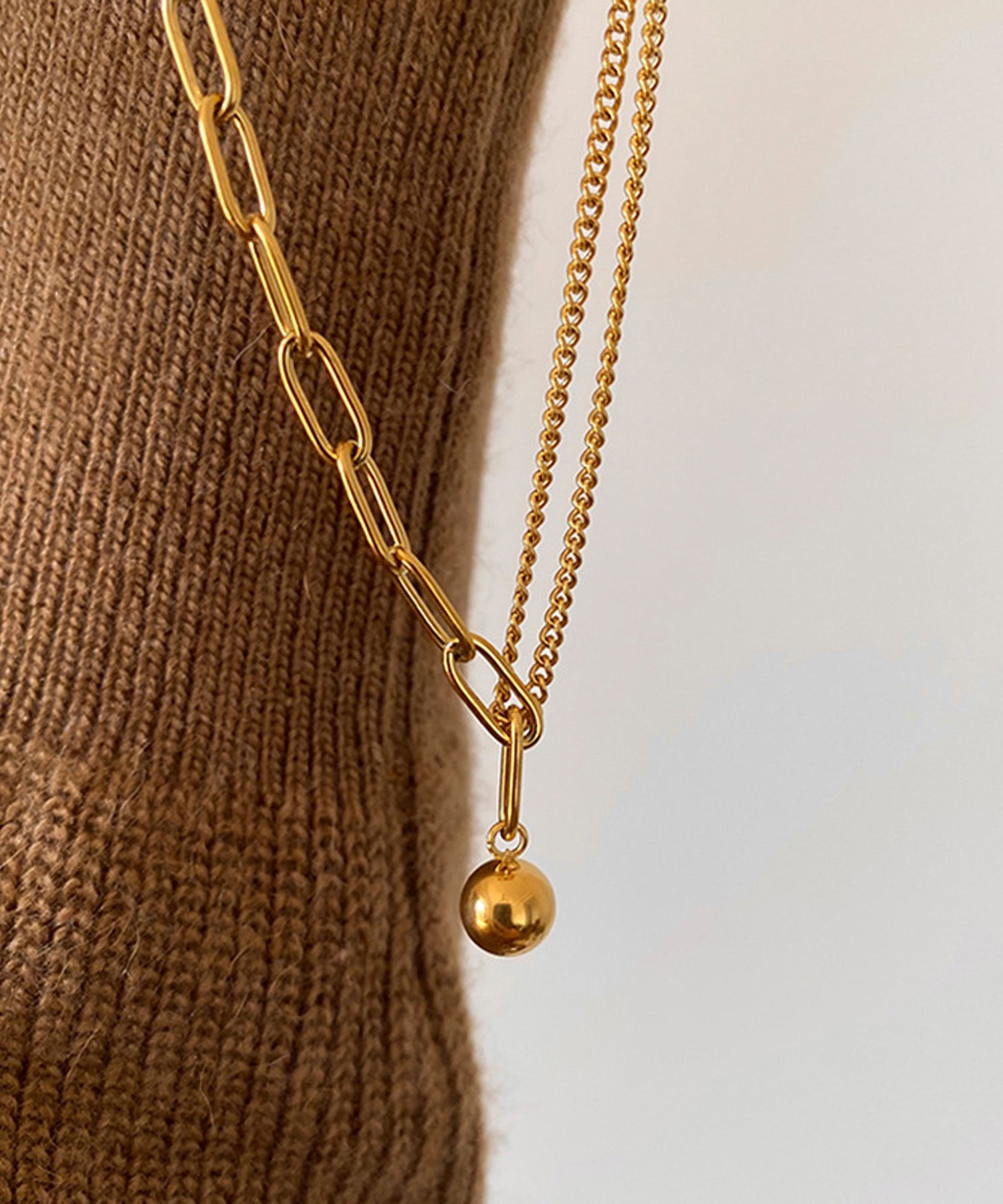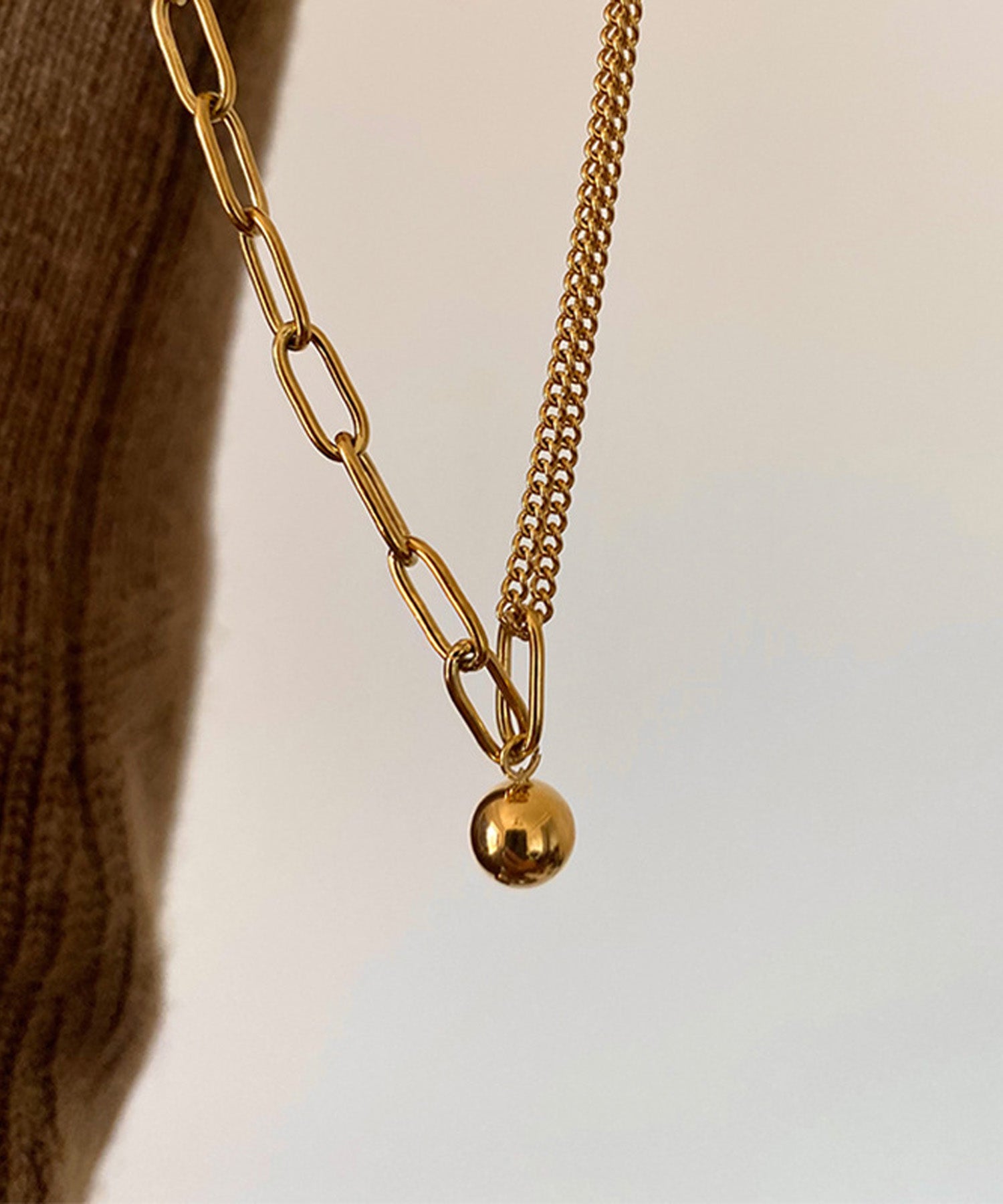チェーンとボールペンダントの組み合わせが、コーデをぐっと格上げします。
