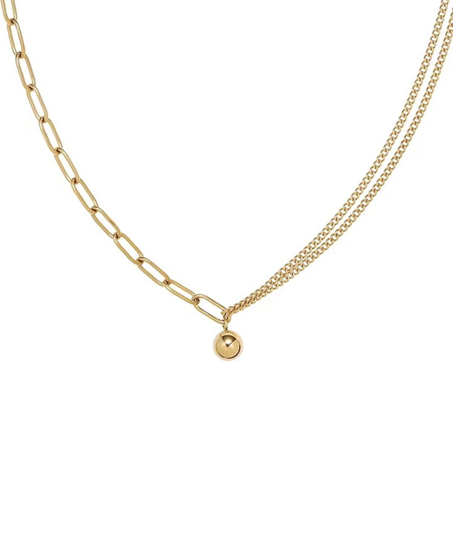 2種類の異なるチェーンを組み合わせた、アシンメトリーなゴールドネックレス。