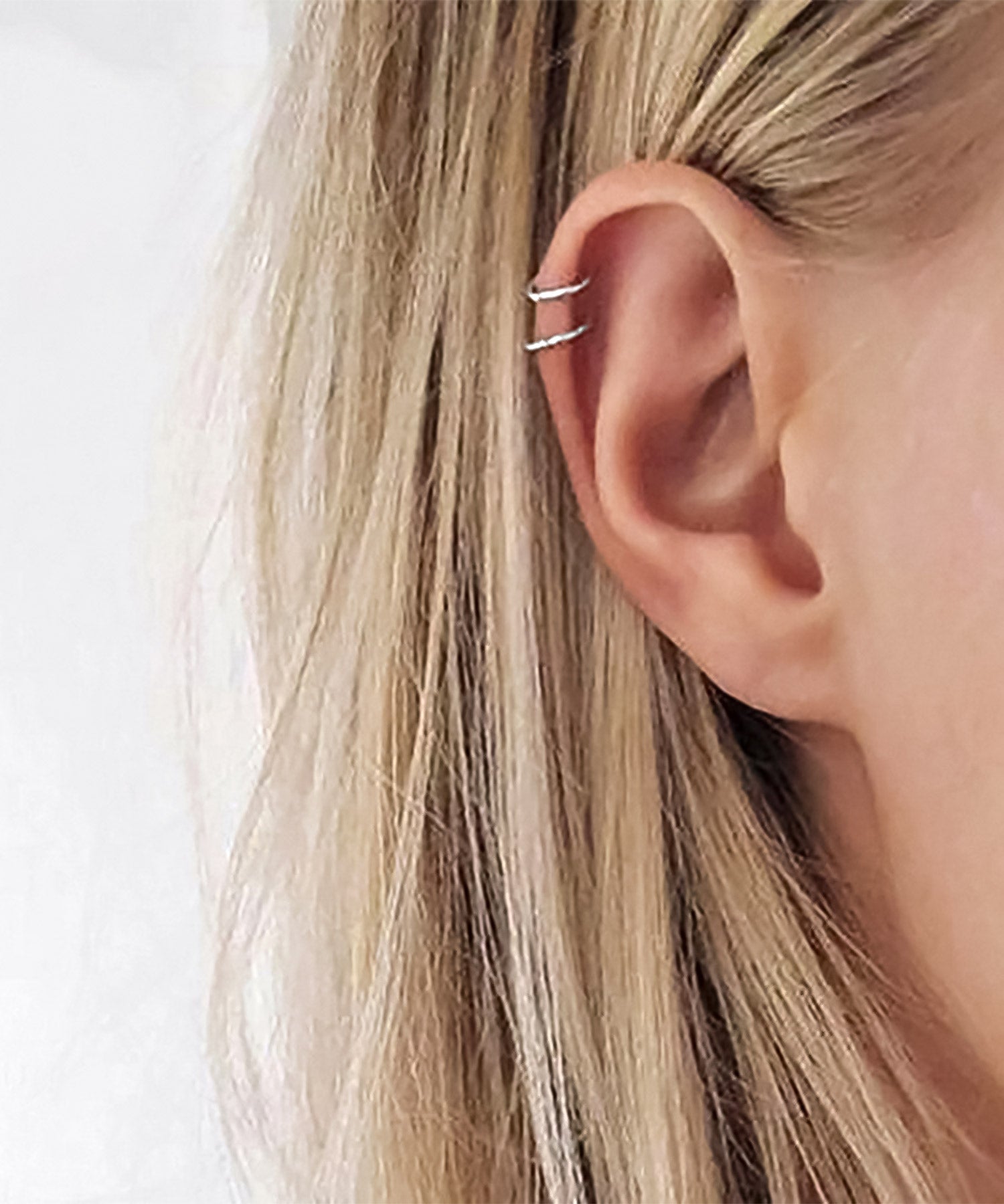 軟骨ピアスをレイヤードでつけているようにも見えます。
