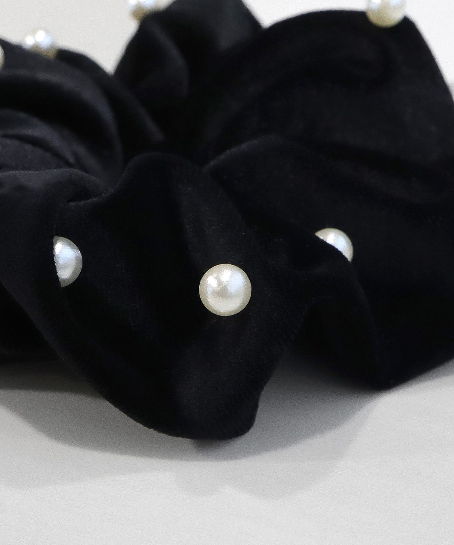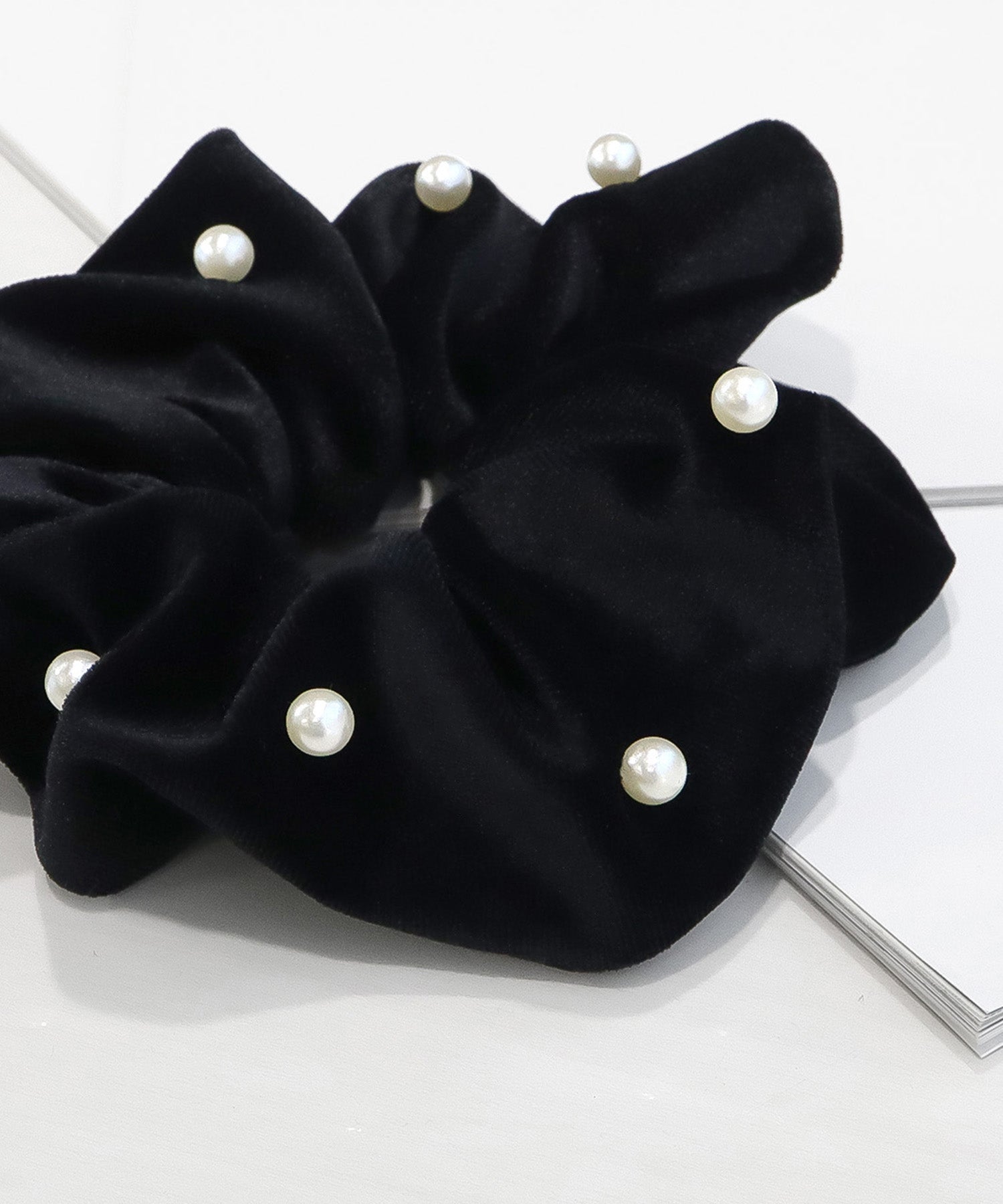 ボリュームのあるシュシュに、ランダムに配されたパールが大人可愛い。