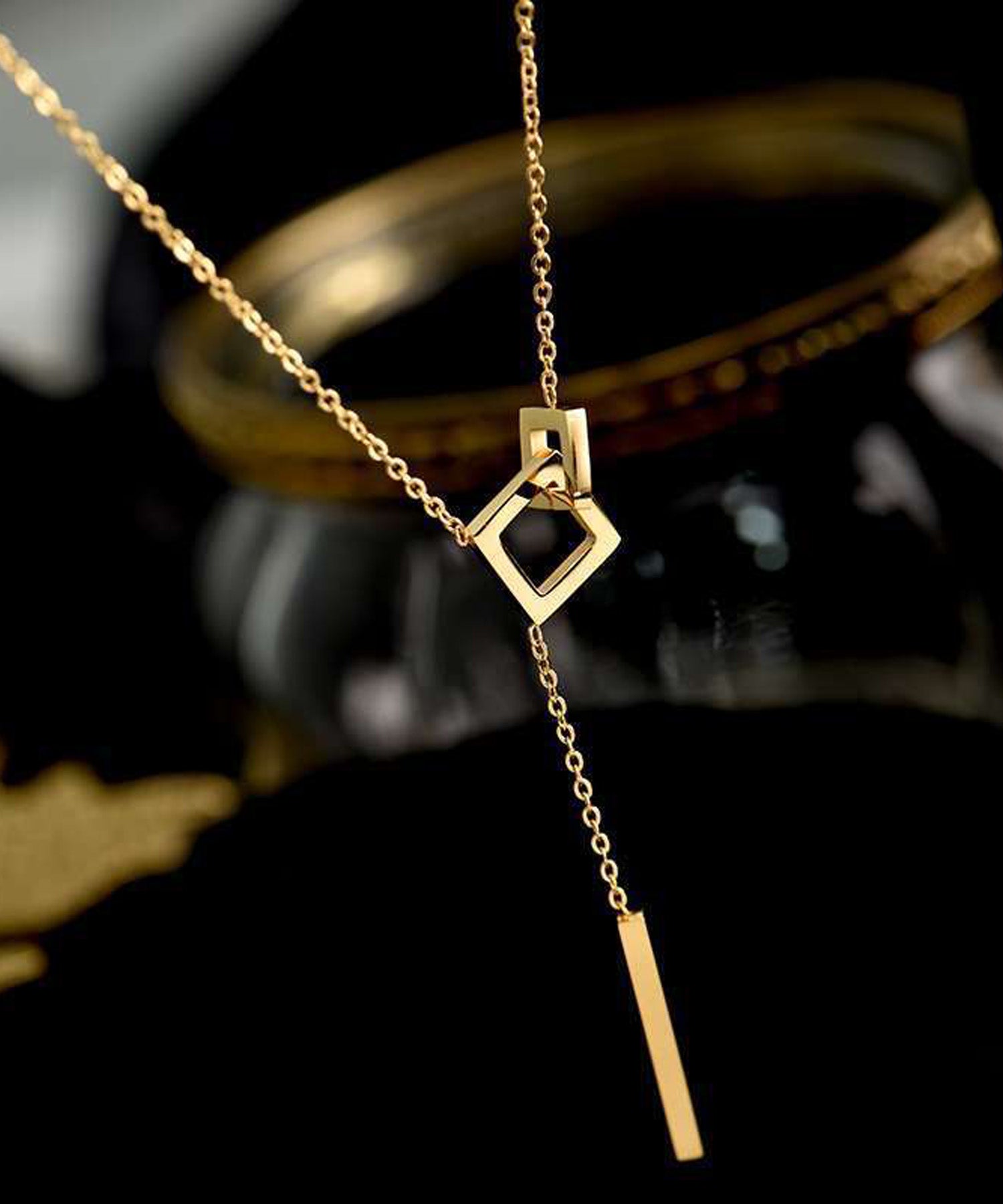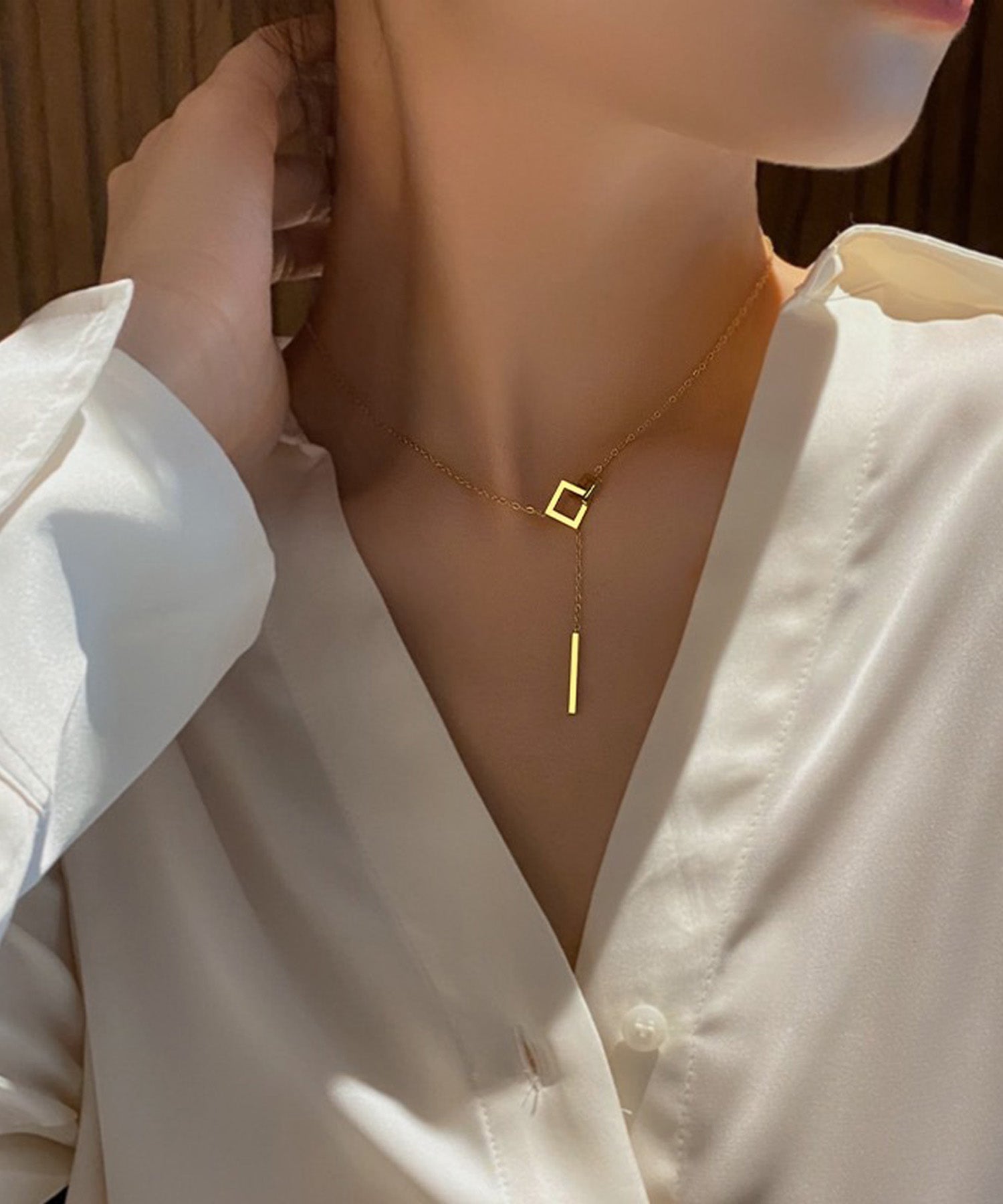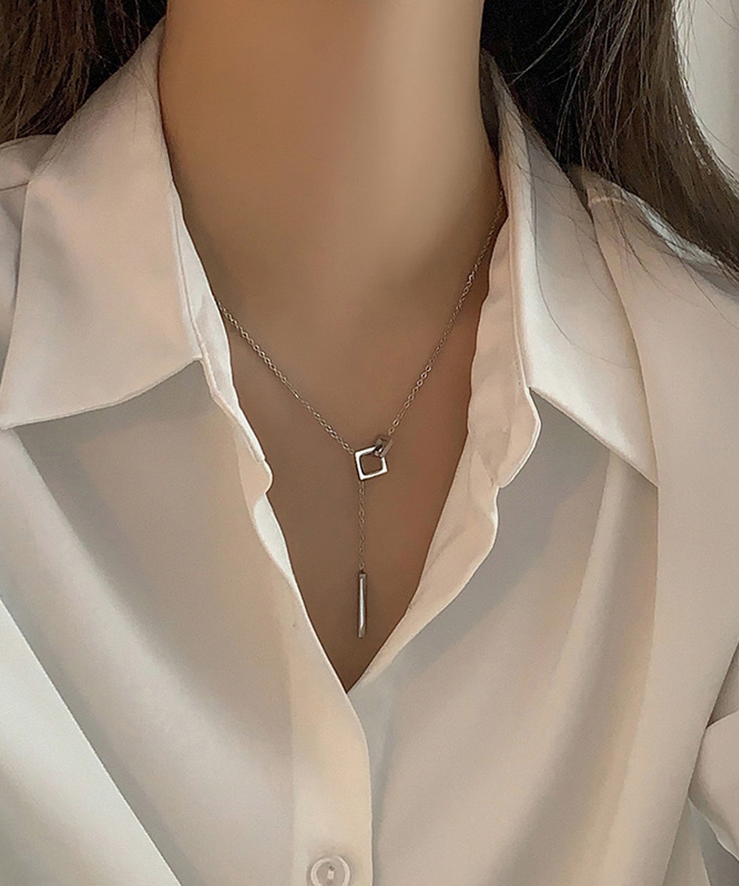 2つのスクエアモチーフにメタルスティックが揺れ動くY字ネックレス。