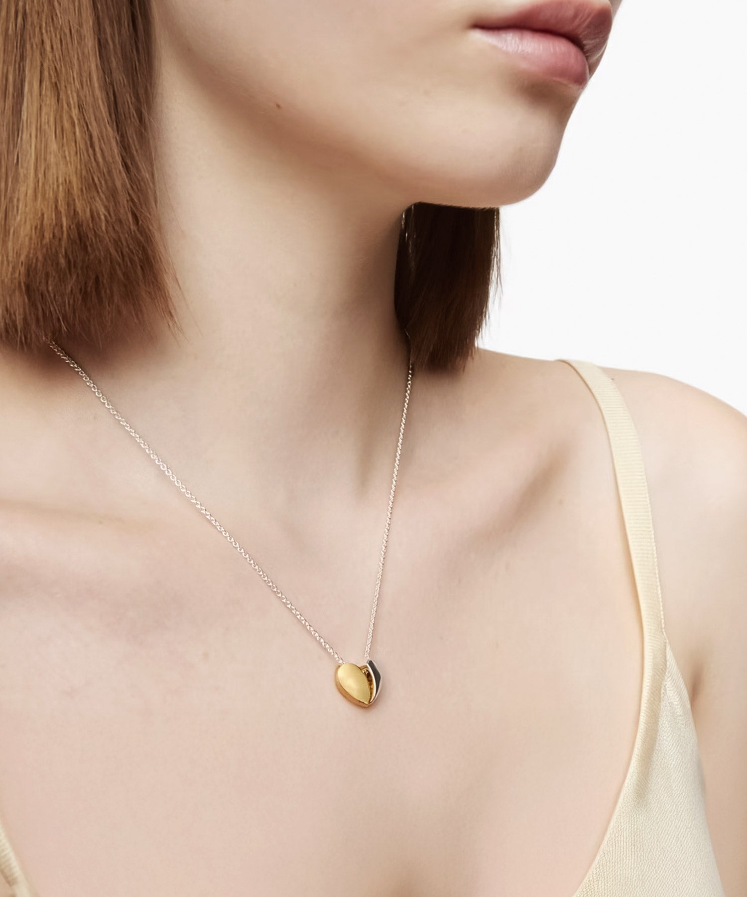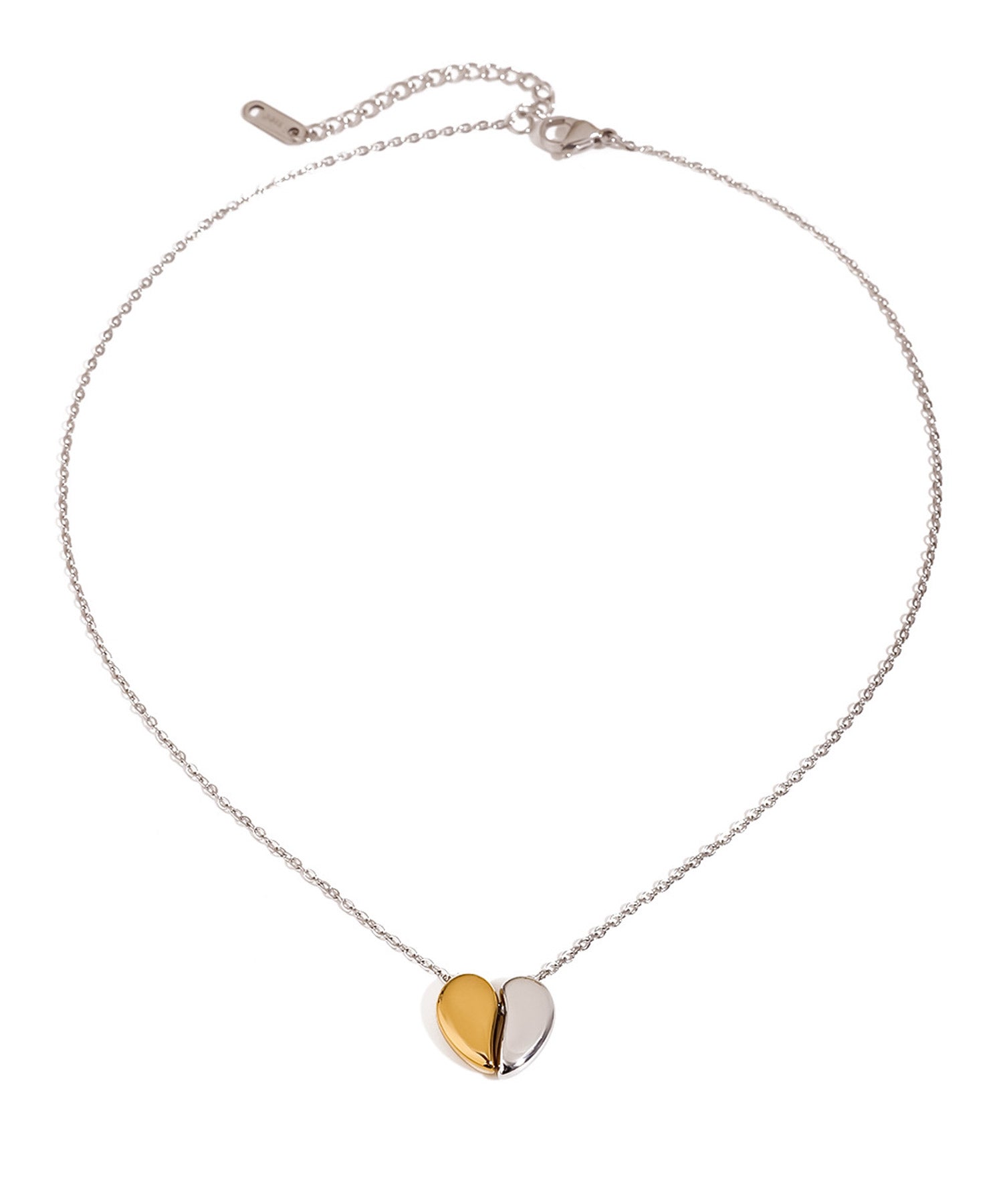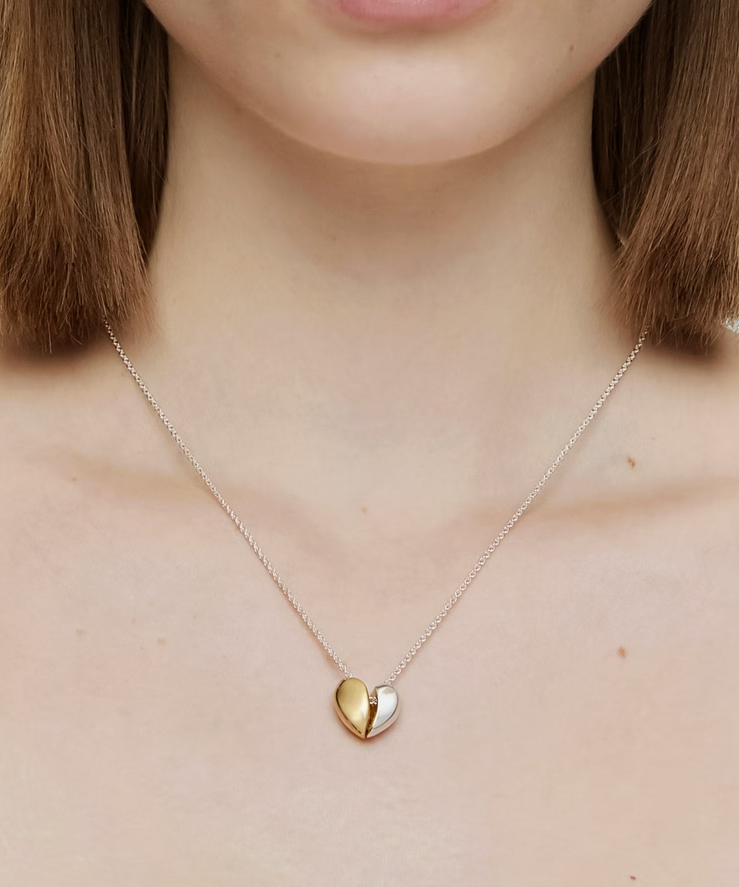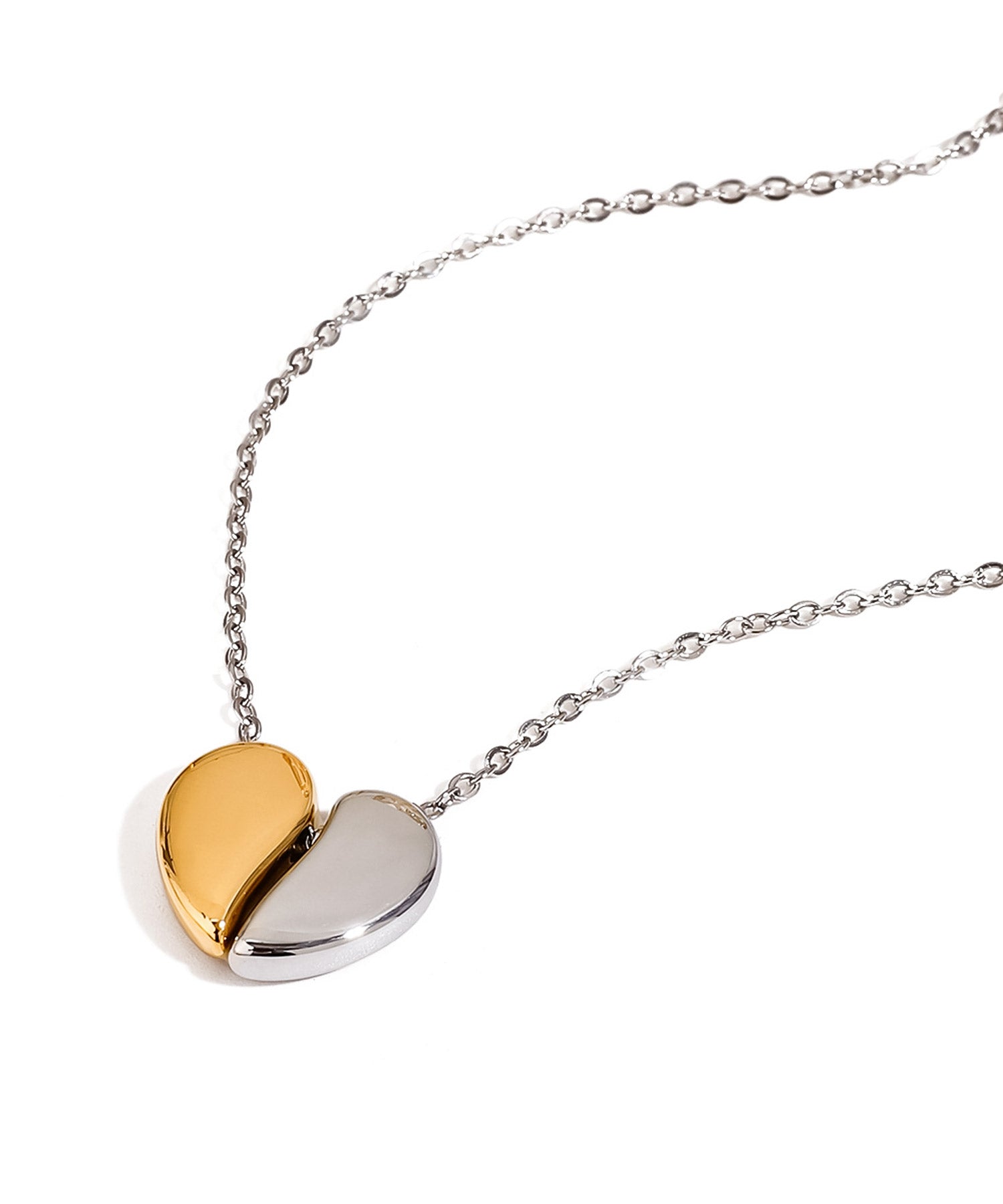 シンプルに艶めくメタルの素材感で、甘くなり過ぎず大人も使えるハートネックレス。
