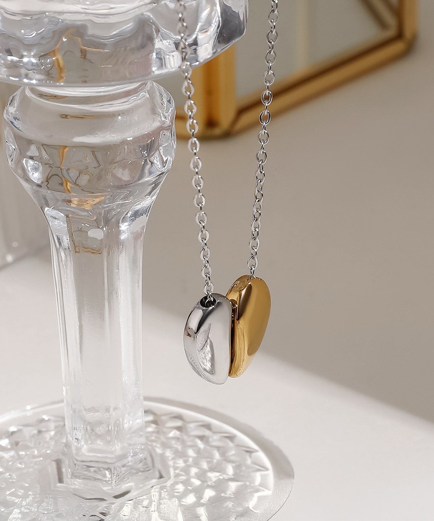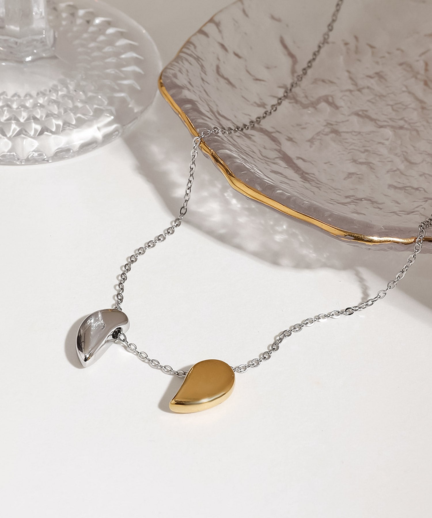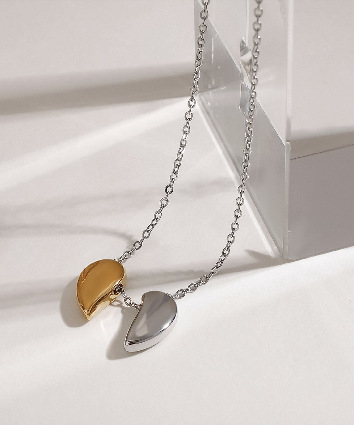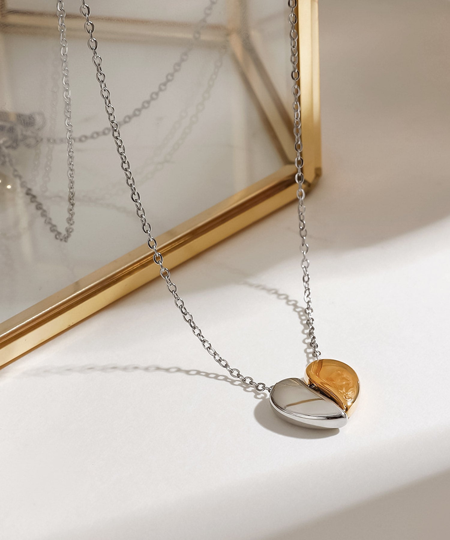 シンプルに艶めくメタルの素材感で、甘くなり過ぎず大人も使えるハートネックレス。