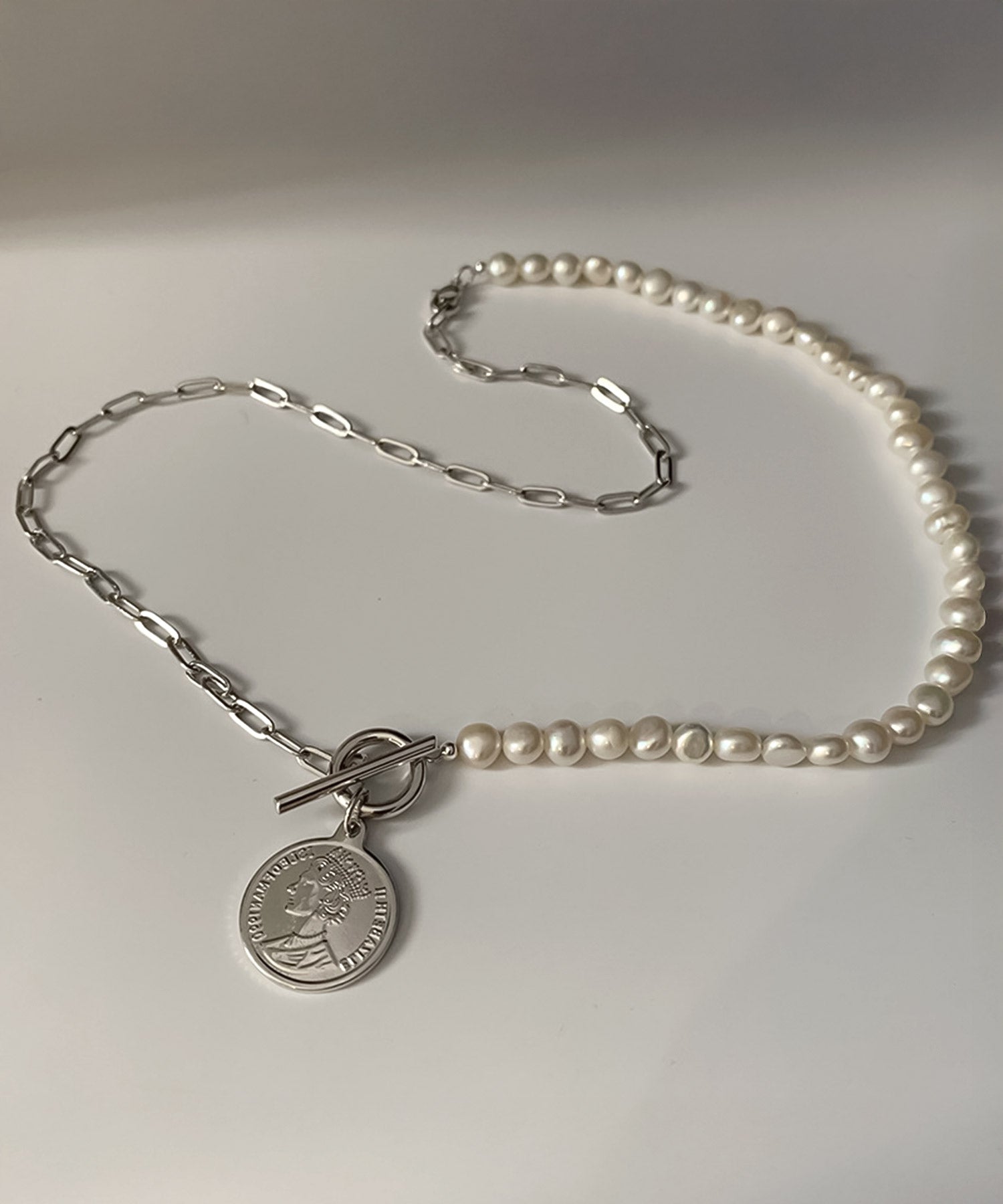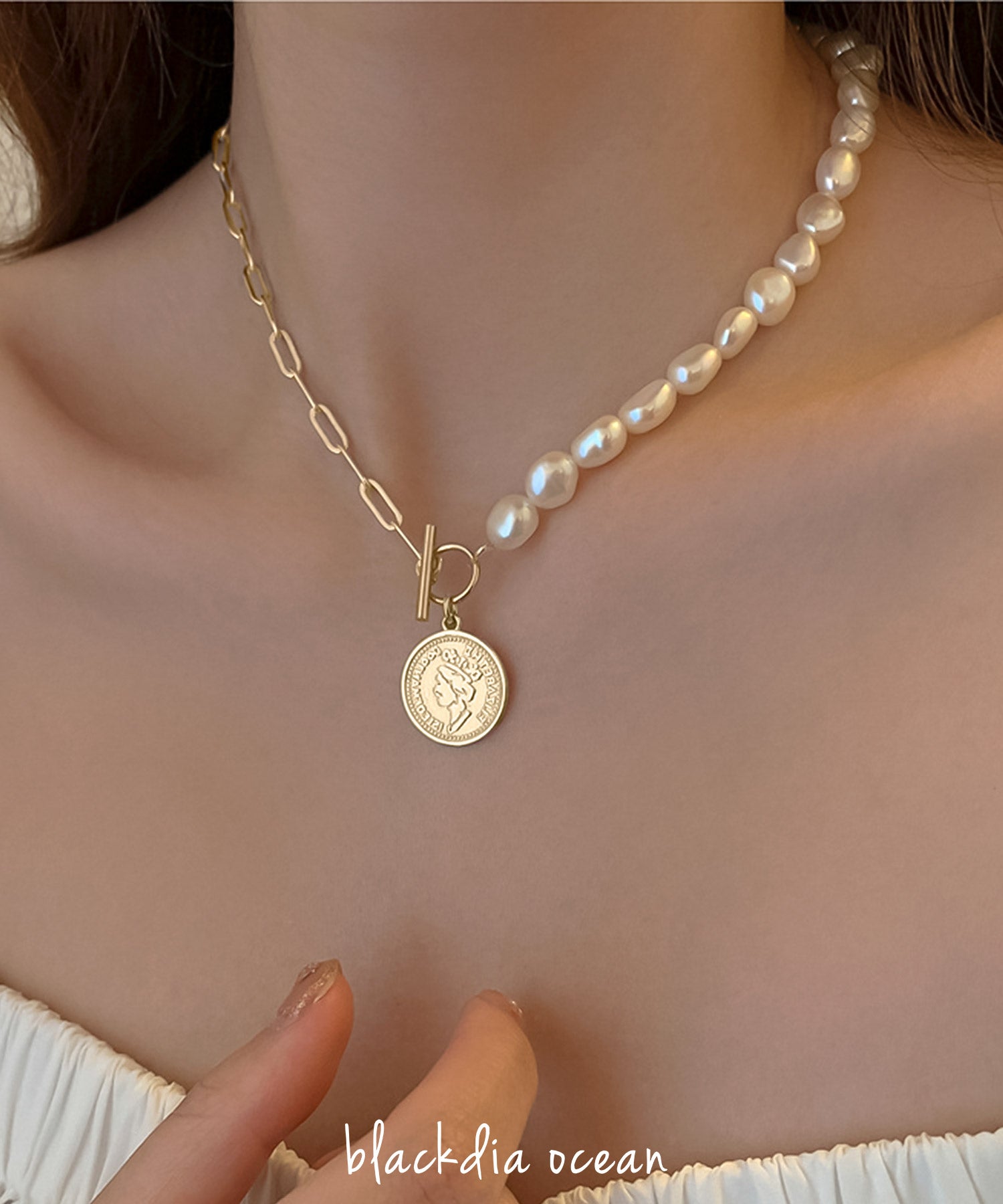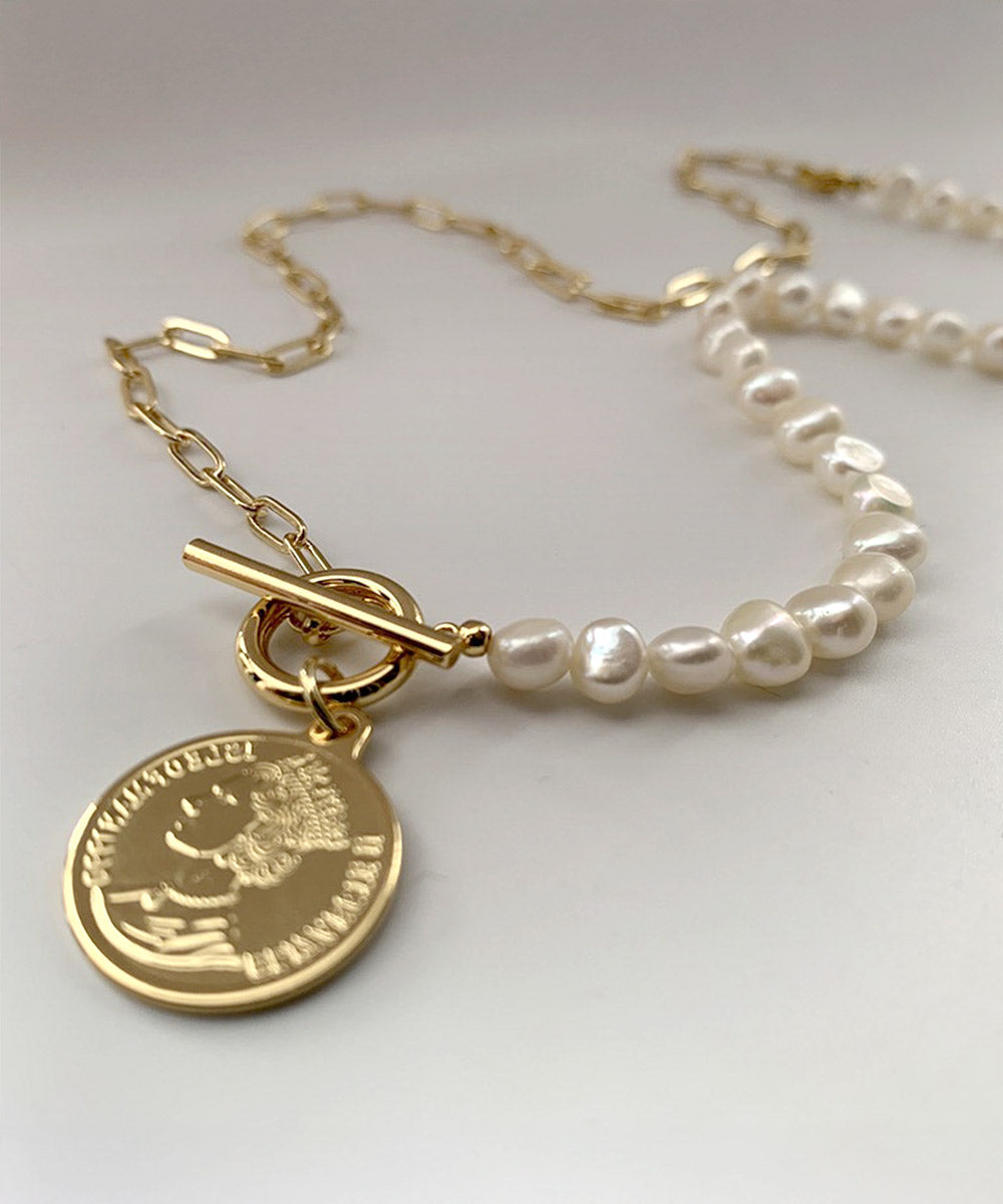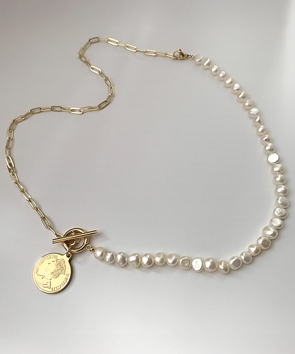 淡水パール×オーバルチェーンのアシンメトリーデザインがおしゃれなコインネックレス。