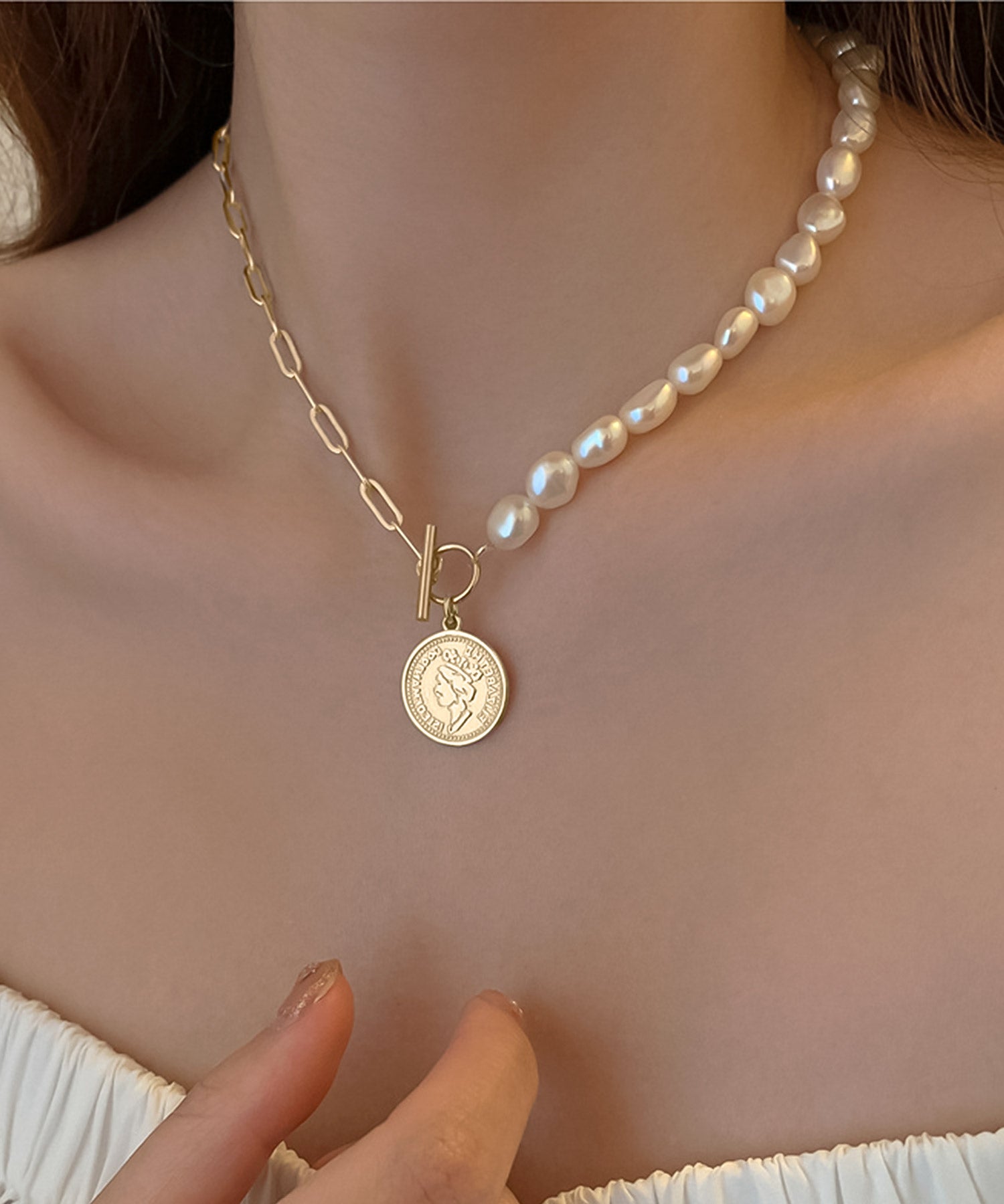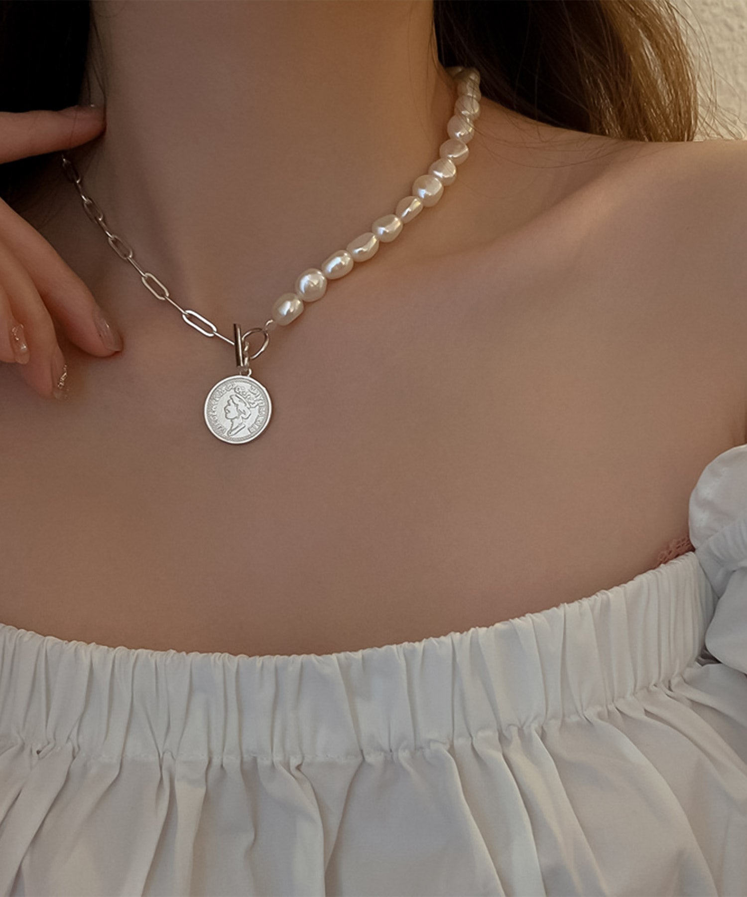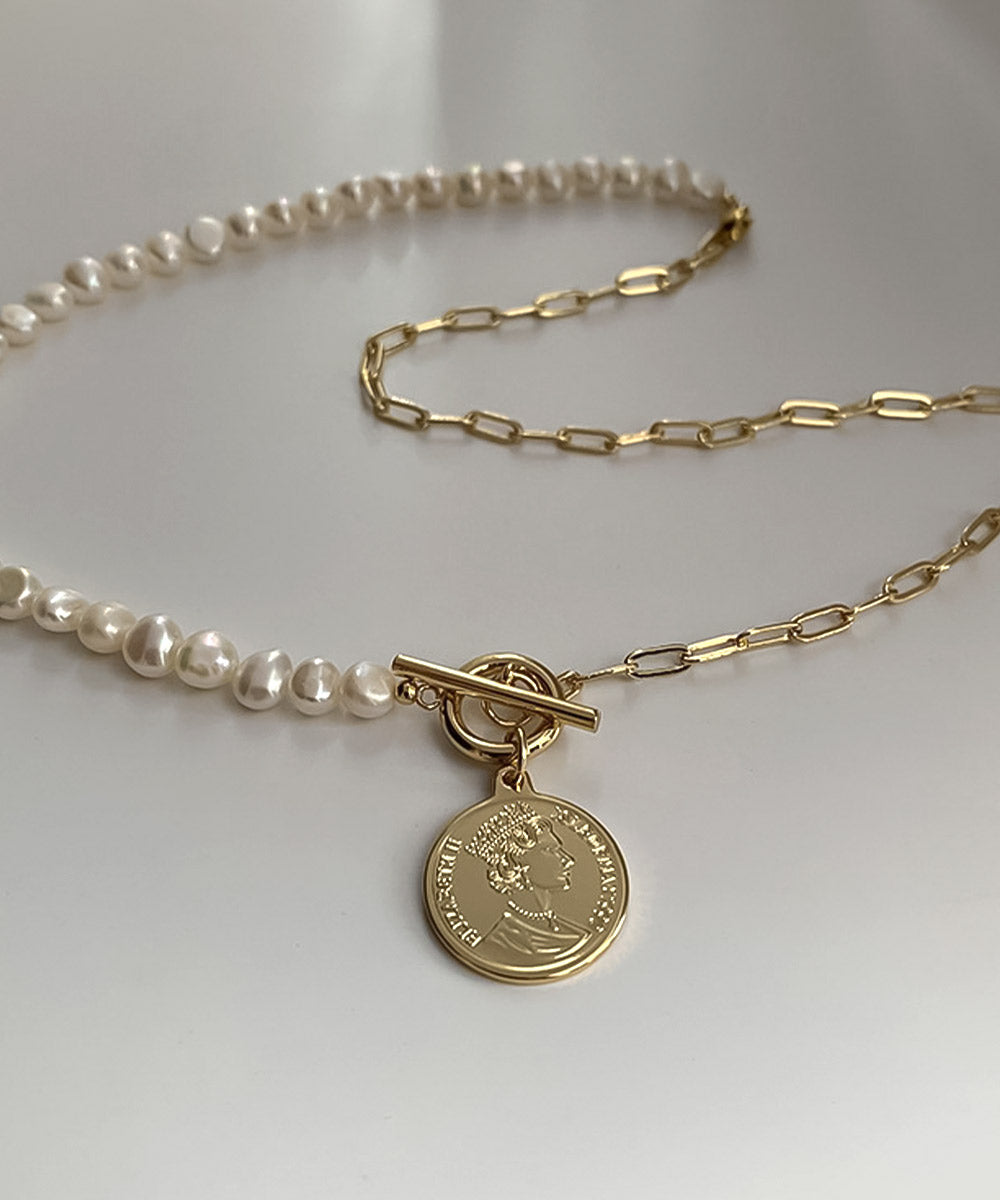 淡水パール×オーバルチェーンのアシンメトリーデザインがおしゃれなコインネックレス。