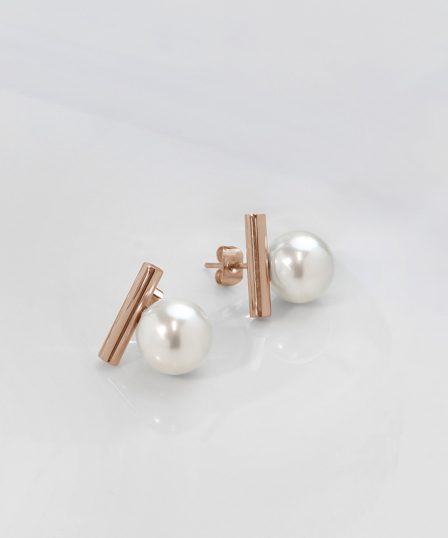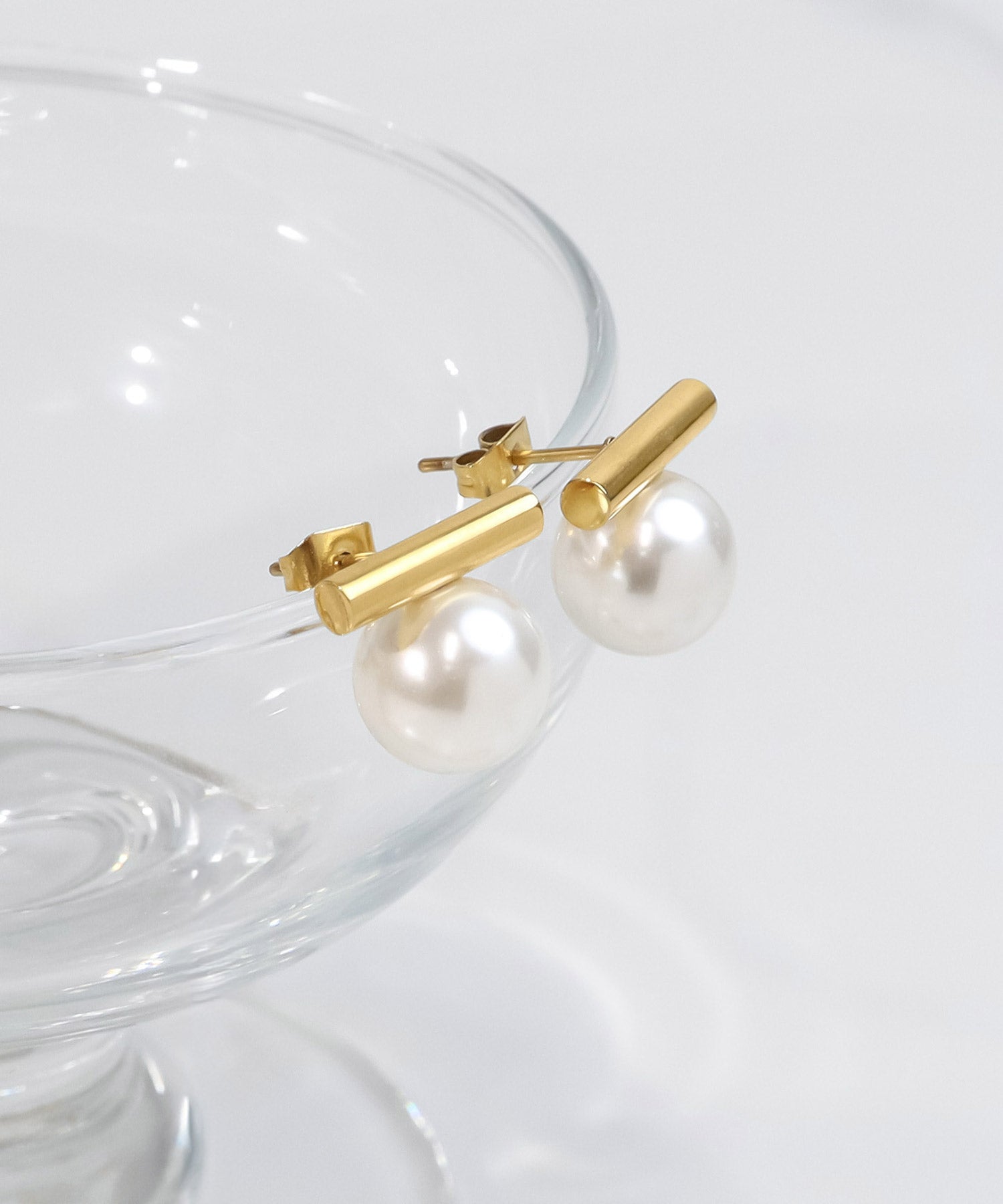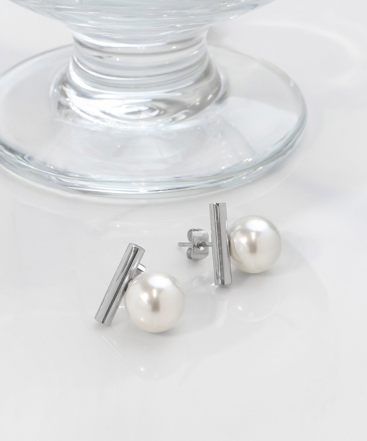 一粒のパールにシンプルなメタルバーを組み合わせたピアス/イヤリング。