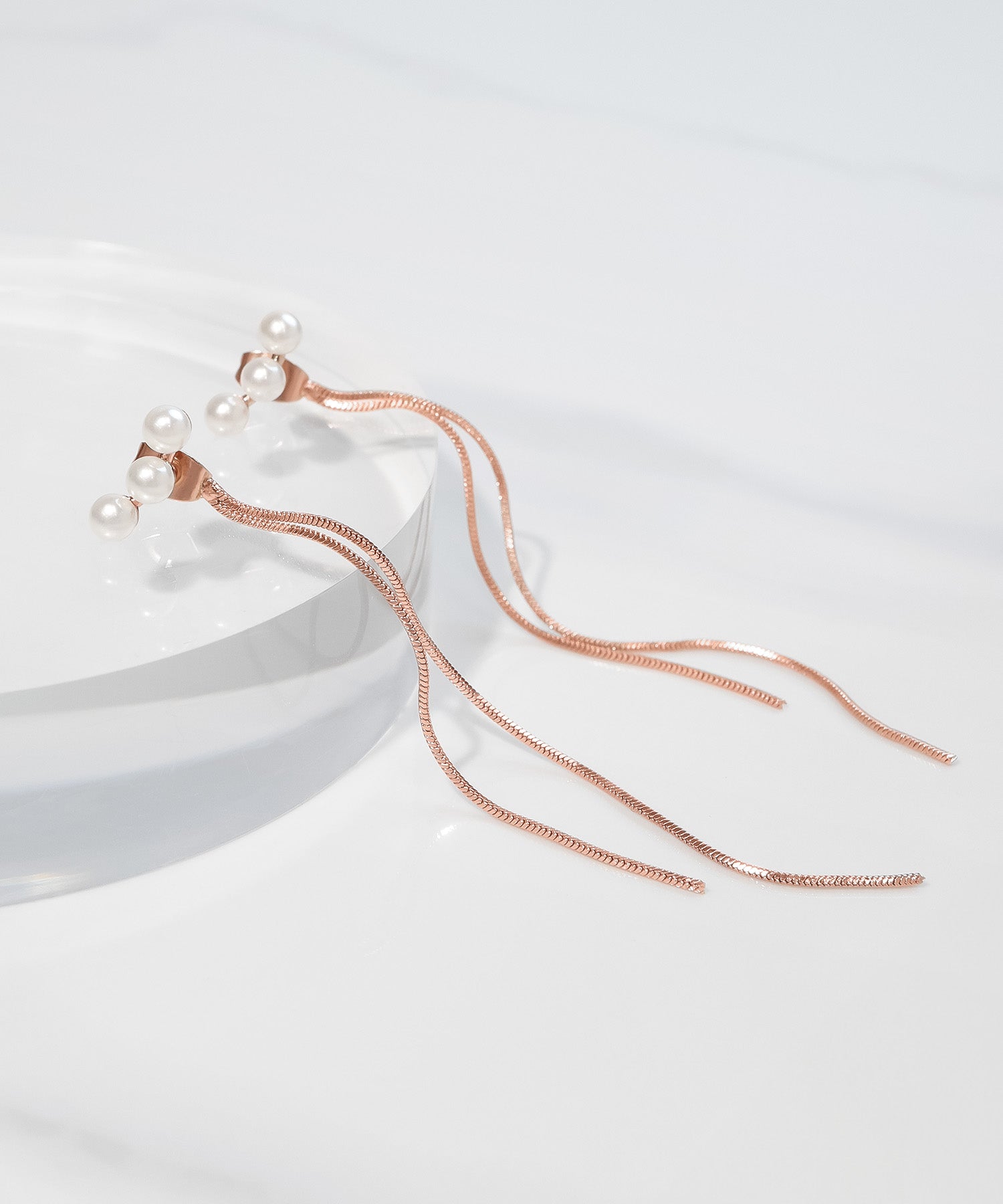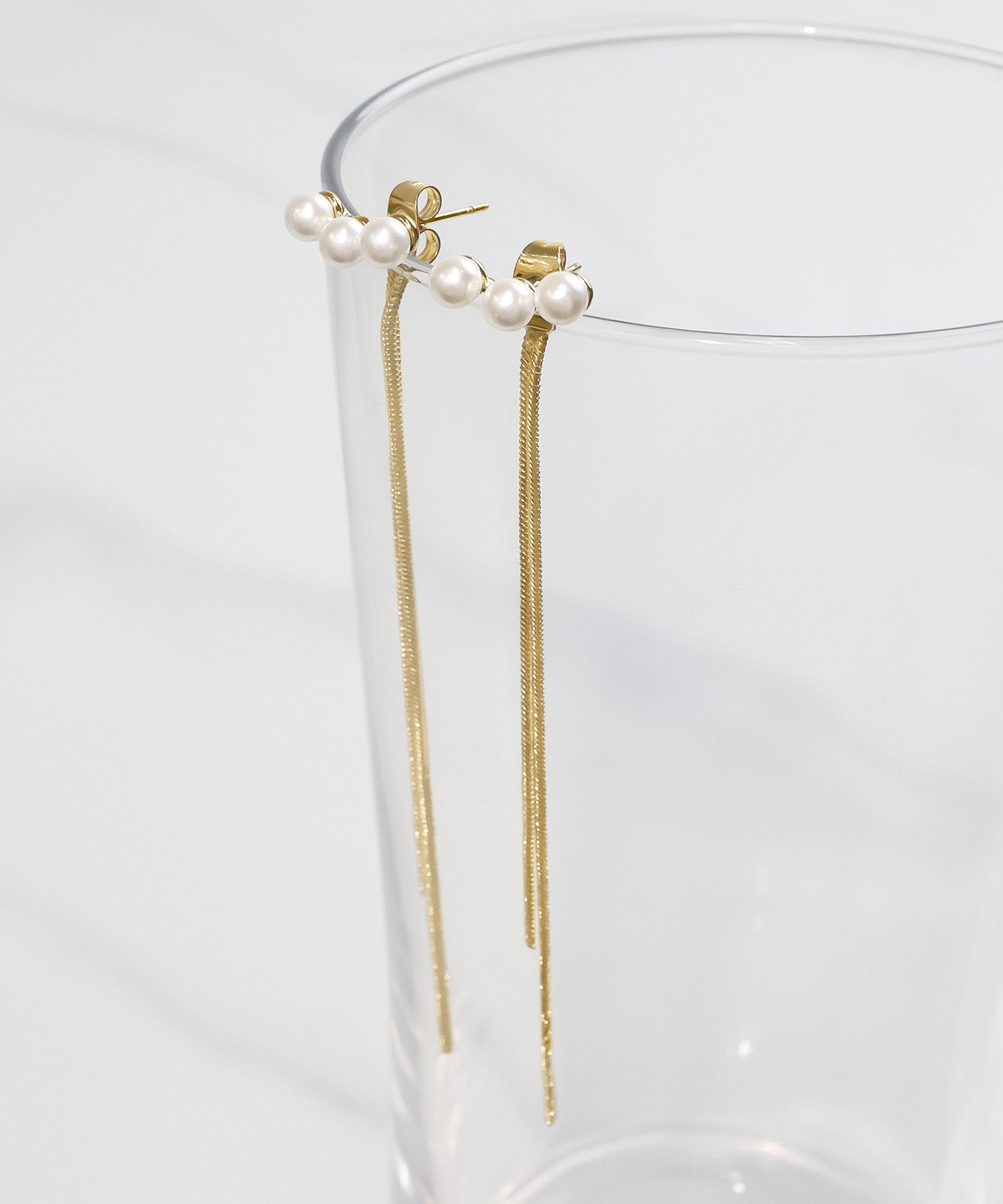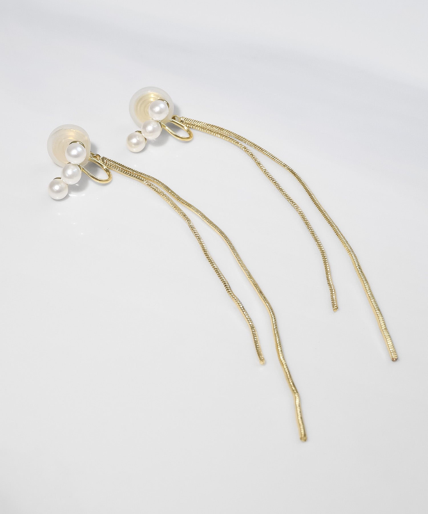 優しく輝く3連パールにしなやかなスネークチェーンが揺らめくロングピアス/イヤリング。