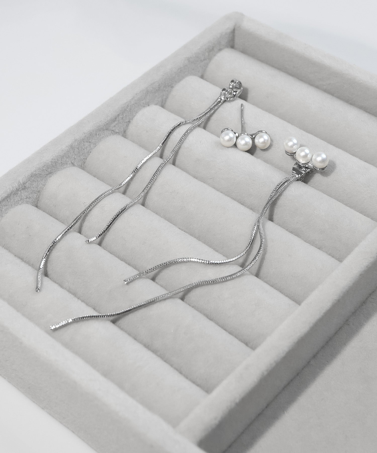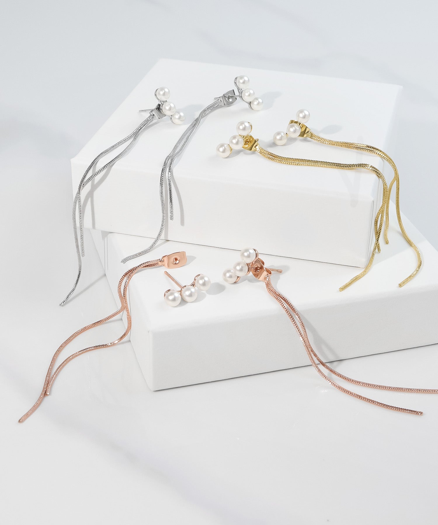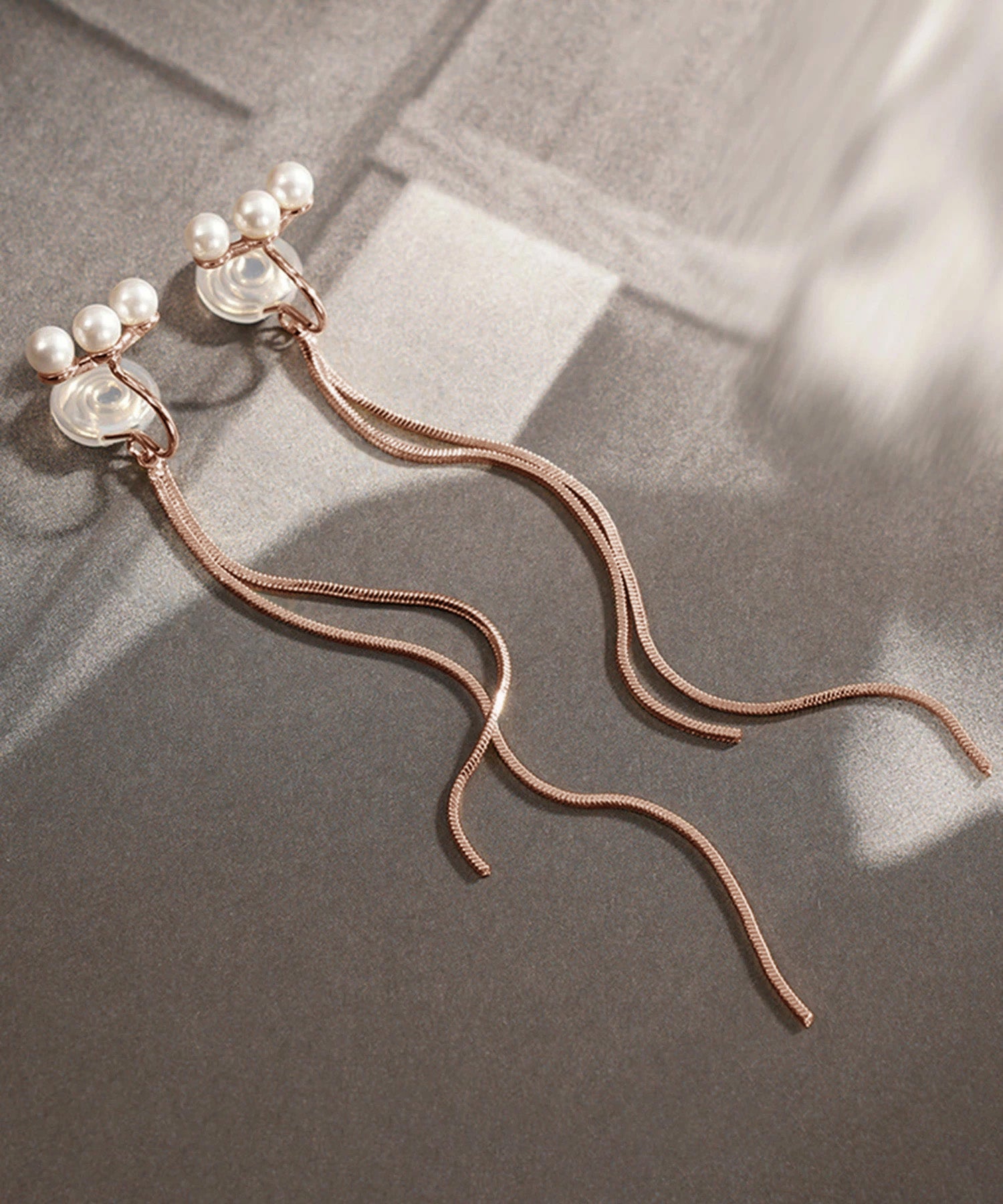 優しく輝く3連パールにしなやかなスネークチェーンが揺らめくロングピアス/イヤリング。