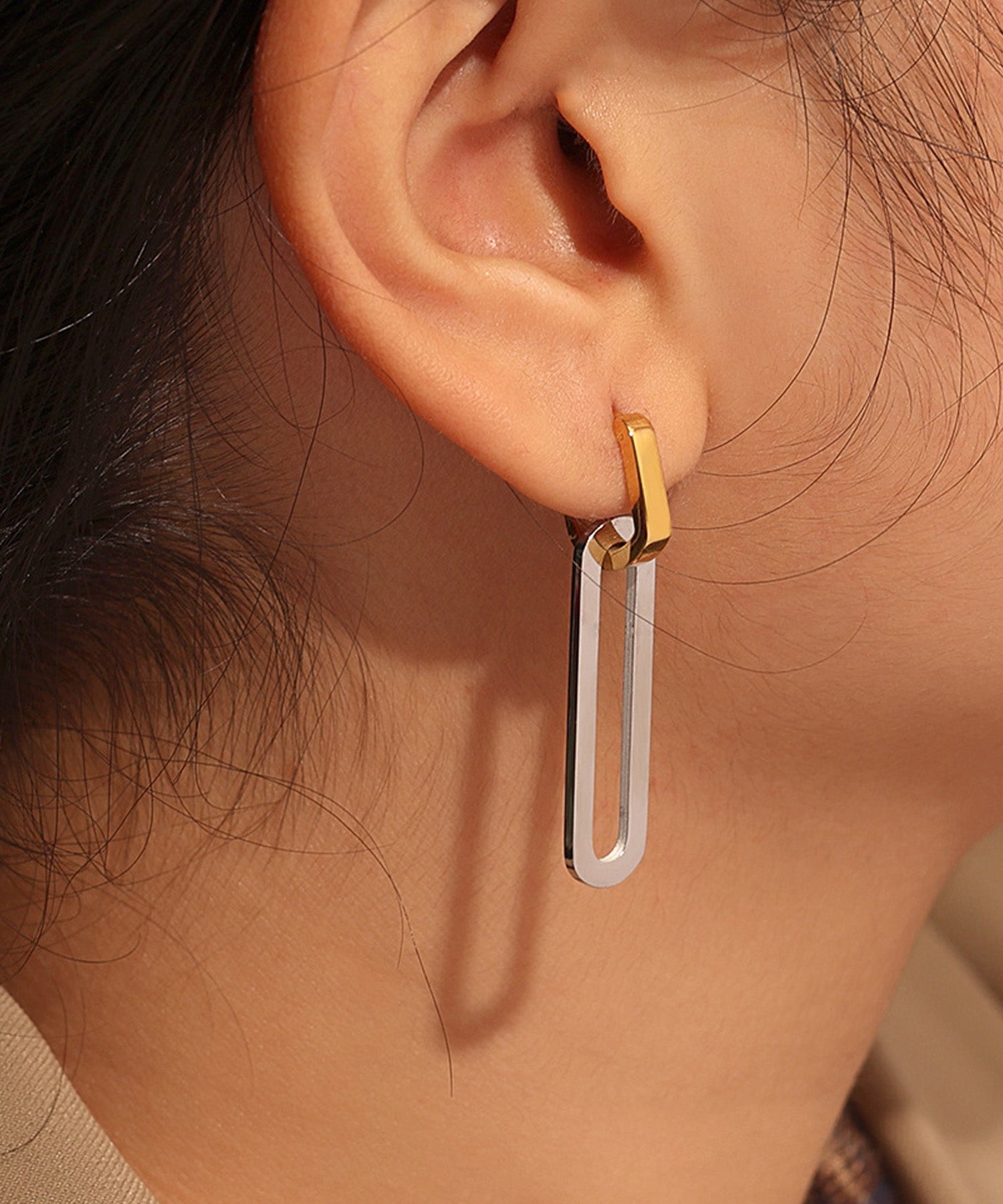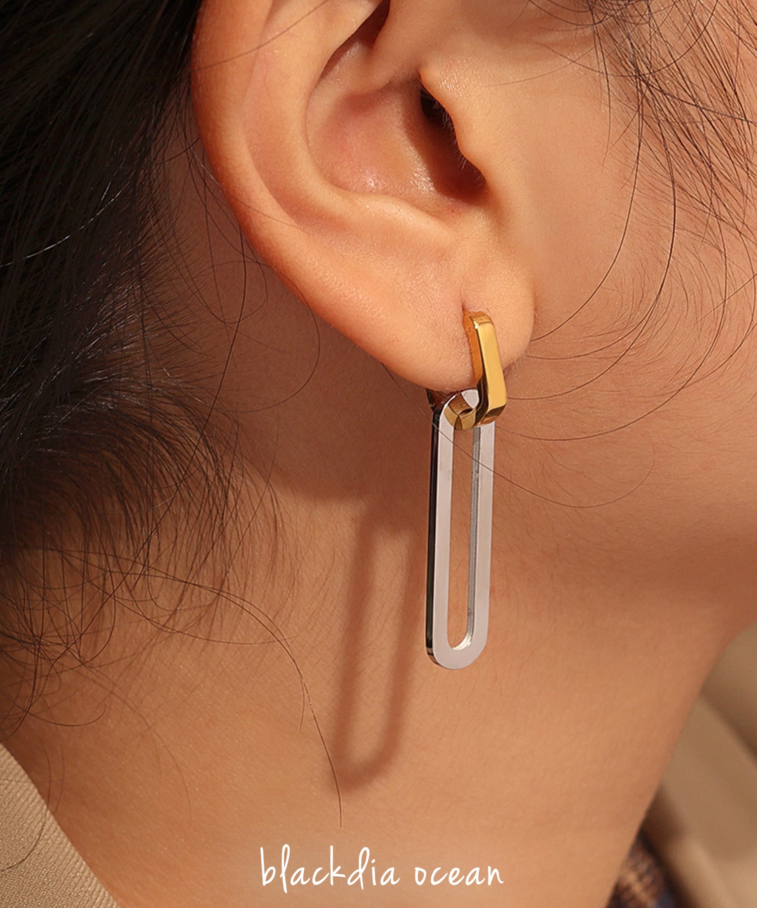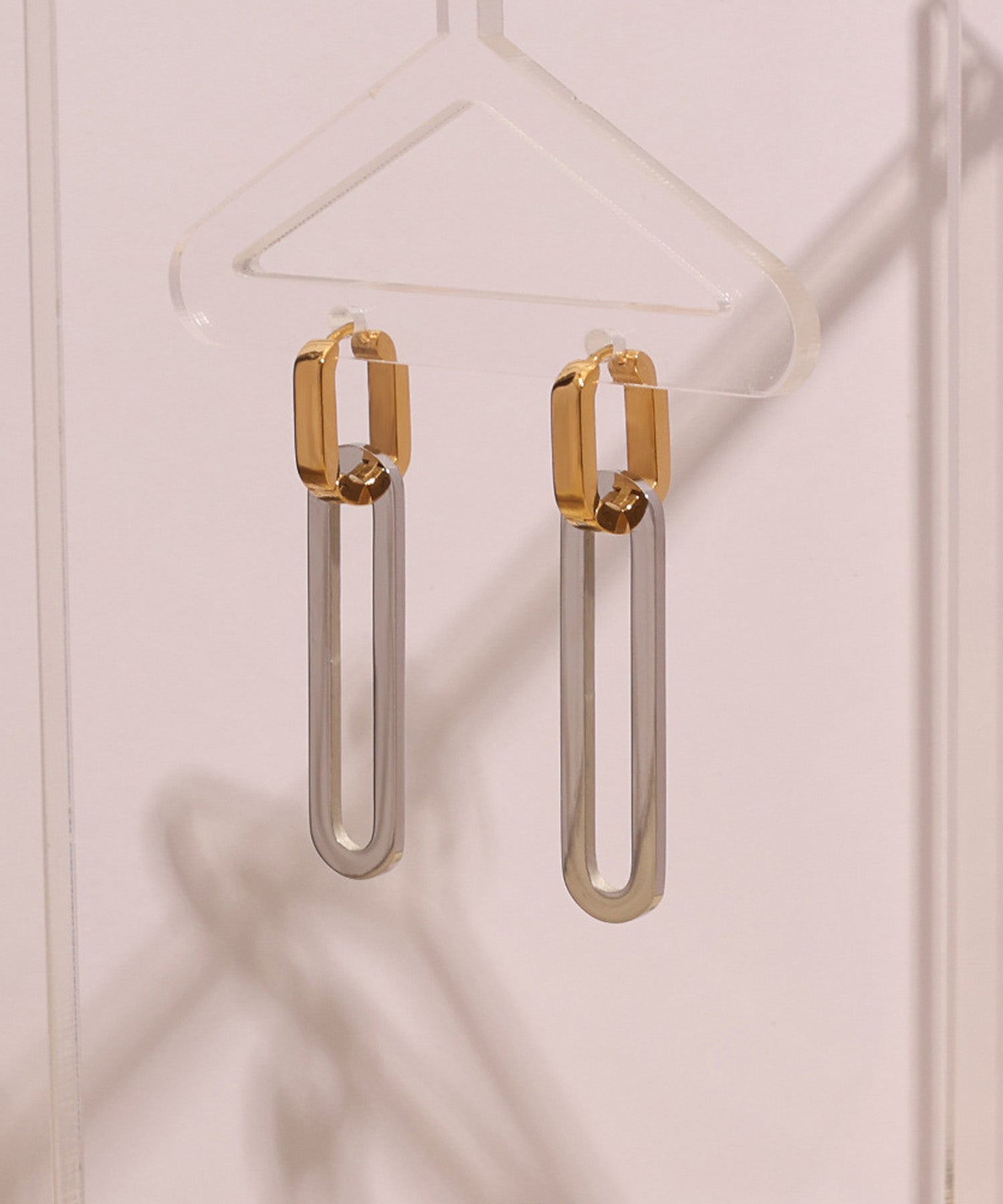 ゴールドとシルバーの幾何学的なフープピアスです。