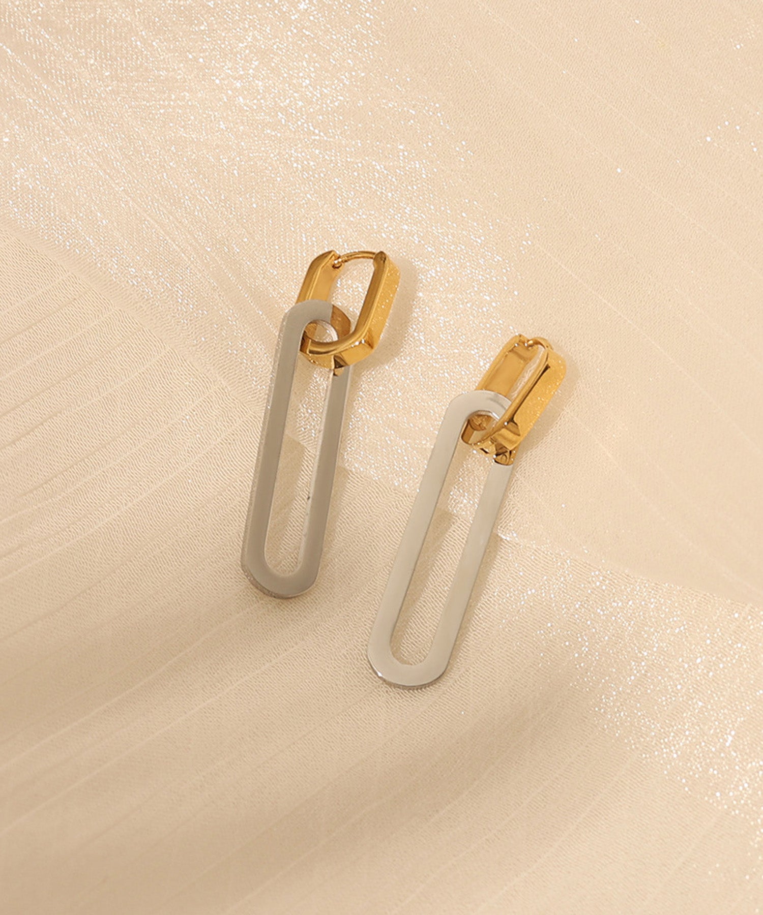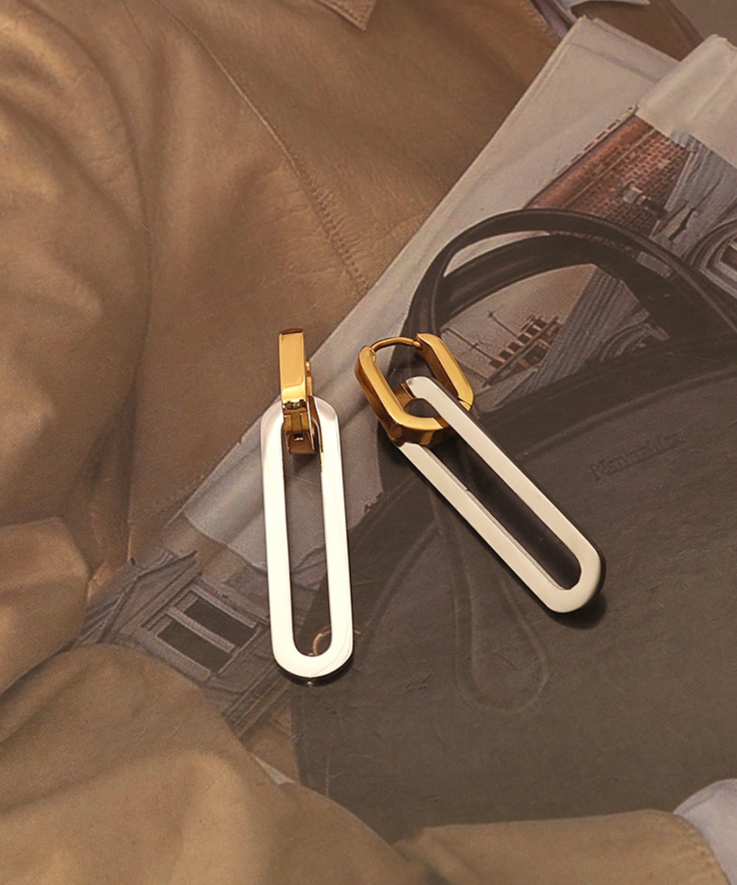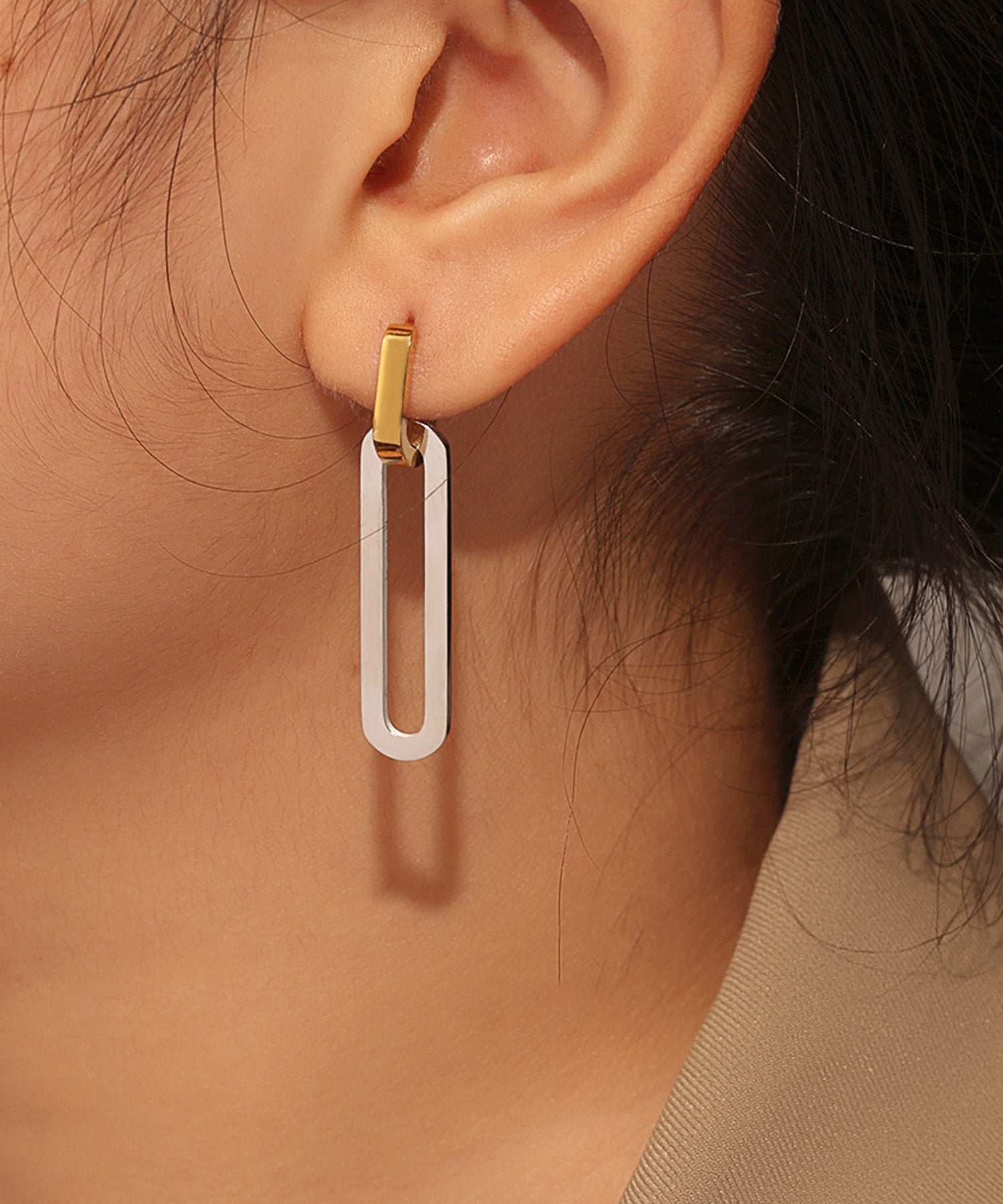 ゴールドとシルバーの幾何学的なフープピアスです。