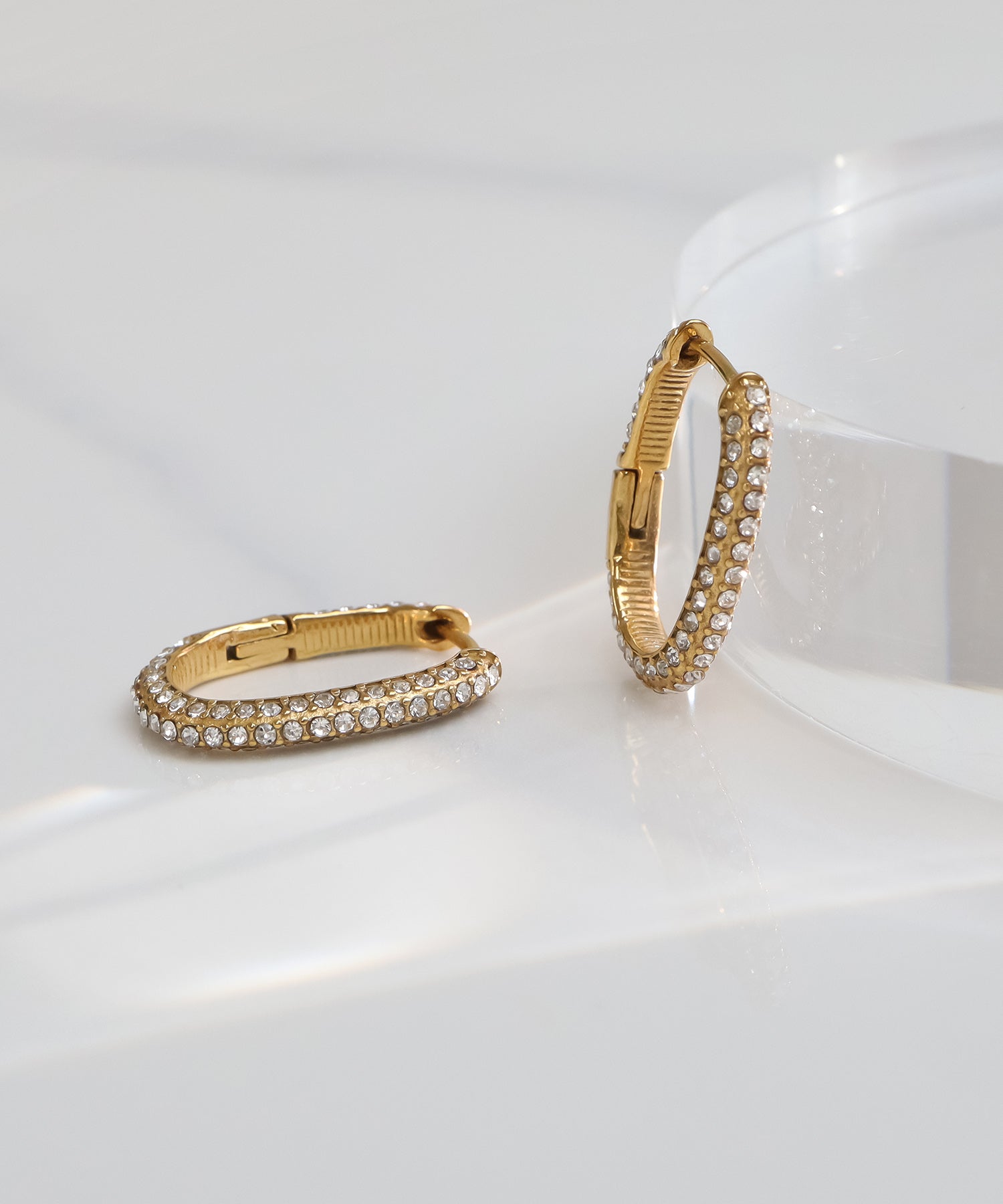 全面に敷き詰められた小さなストーンが、光を反射してきらきらと輝くフープピアスです。