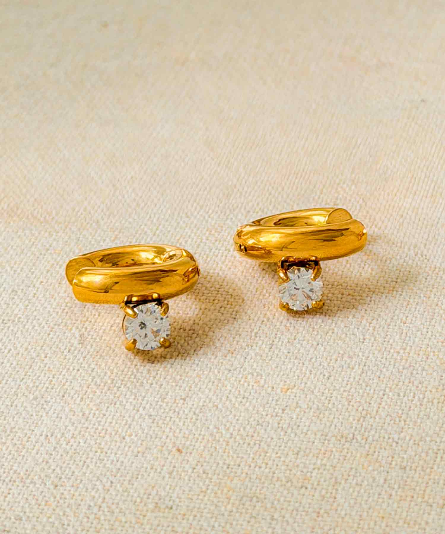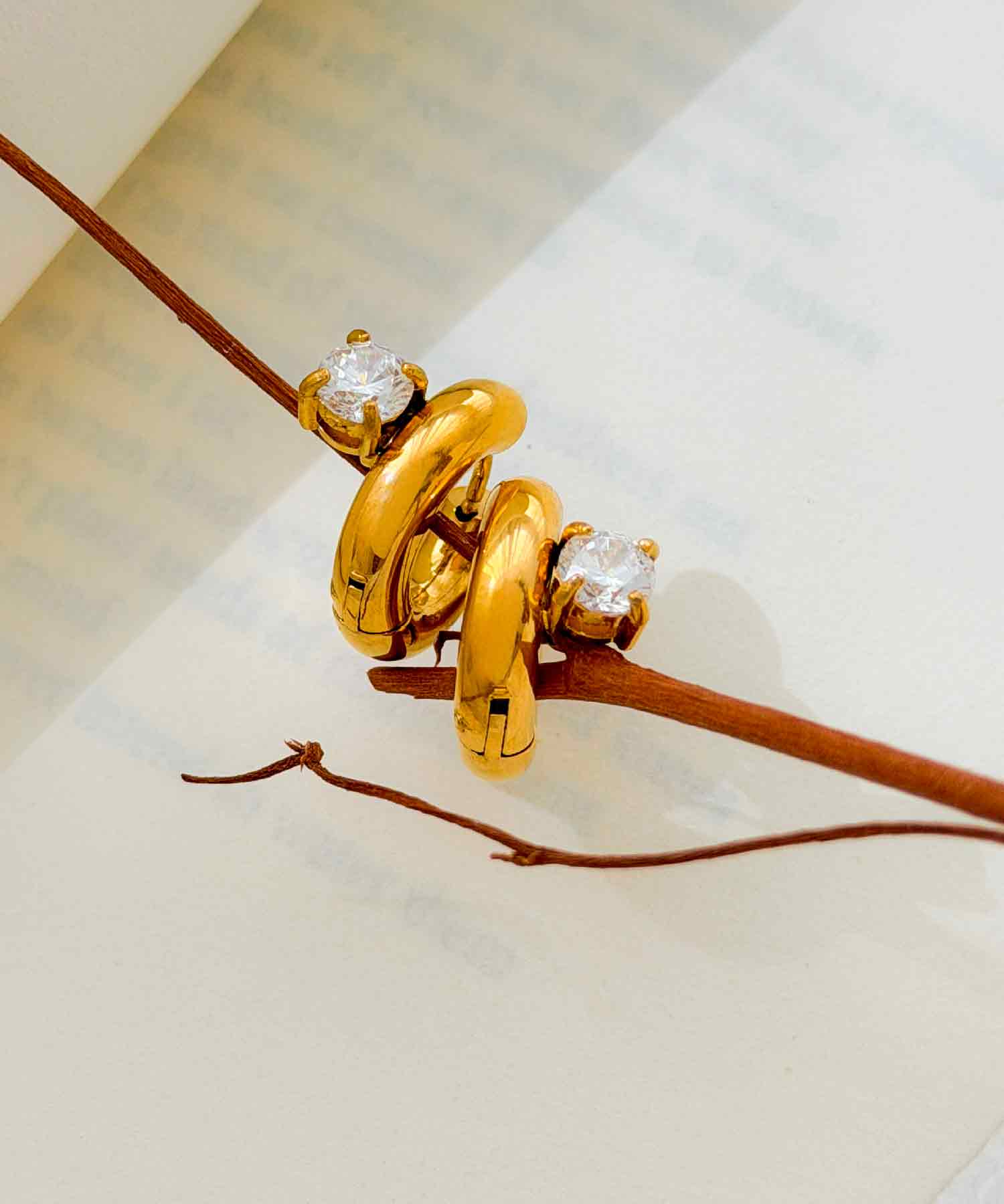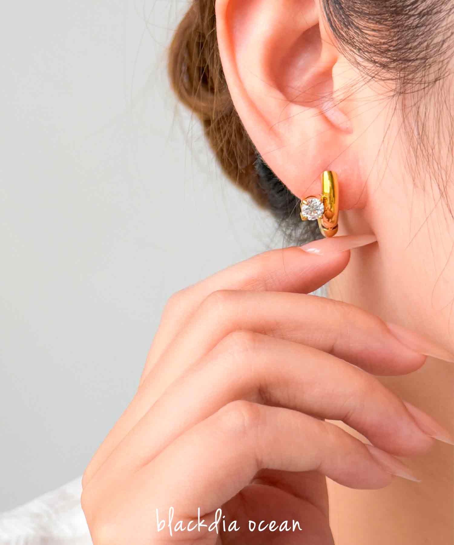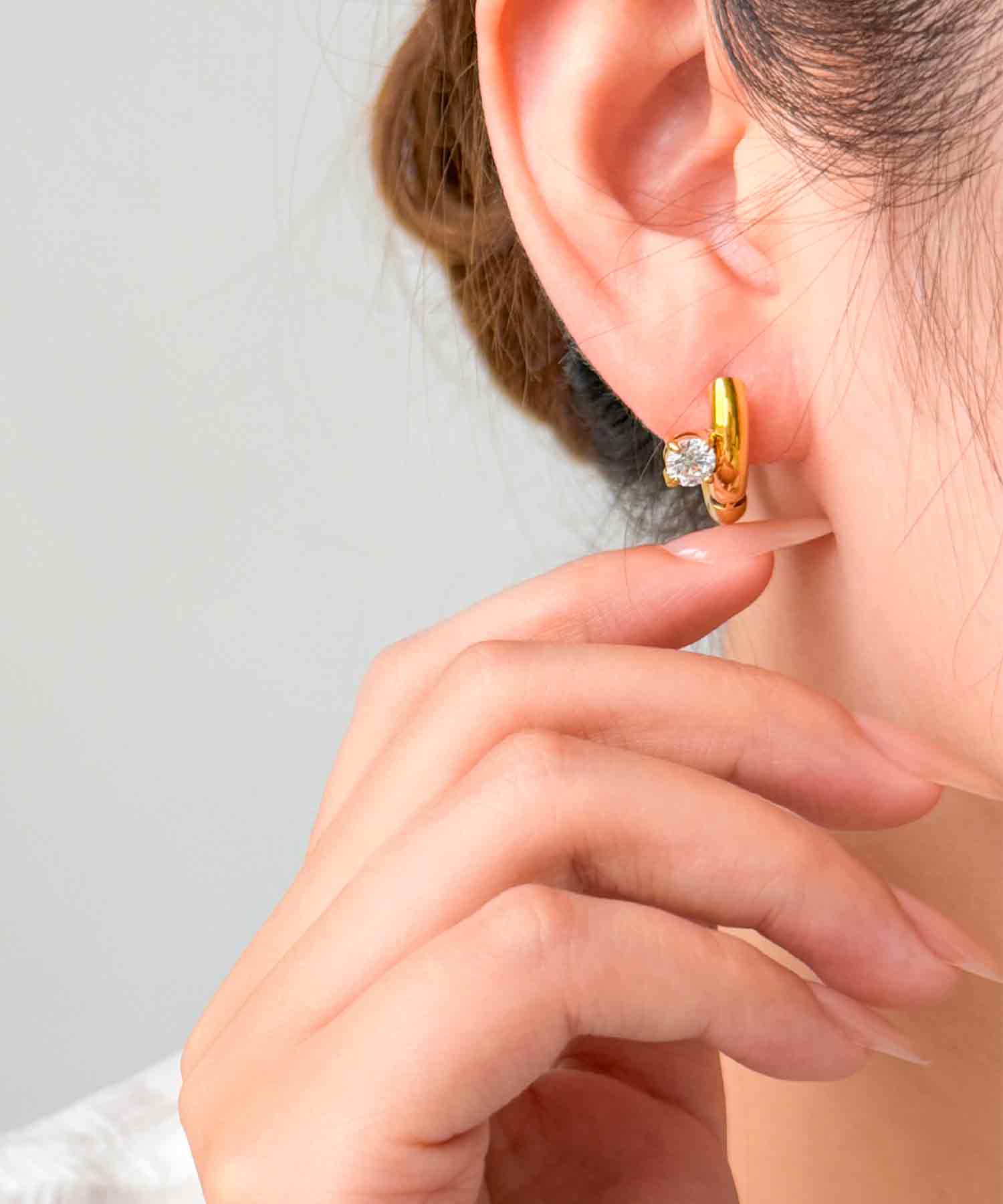 ぷっくりとしたゴールドフープと、一粒ストーンの組み合わせがトレンド感たっぷり。