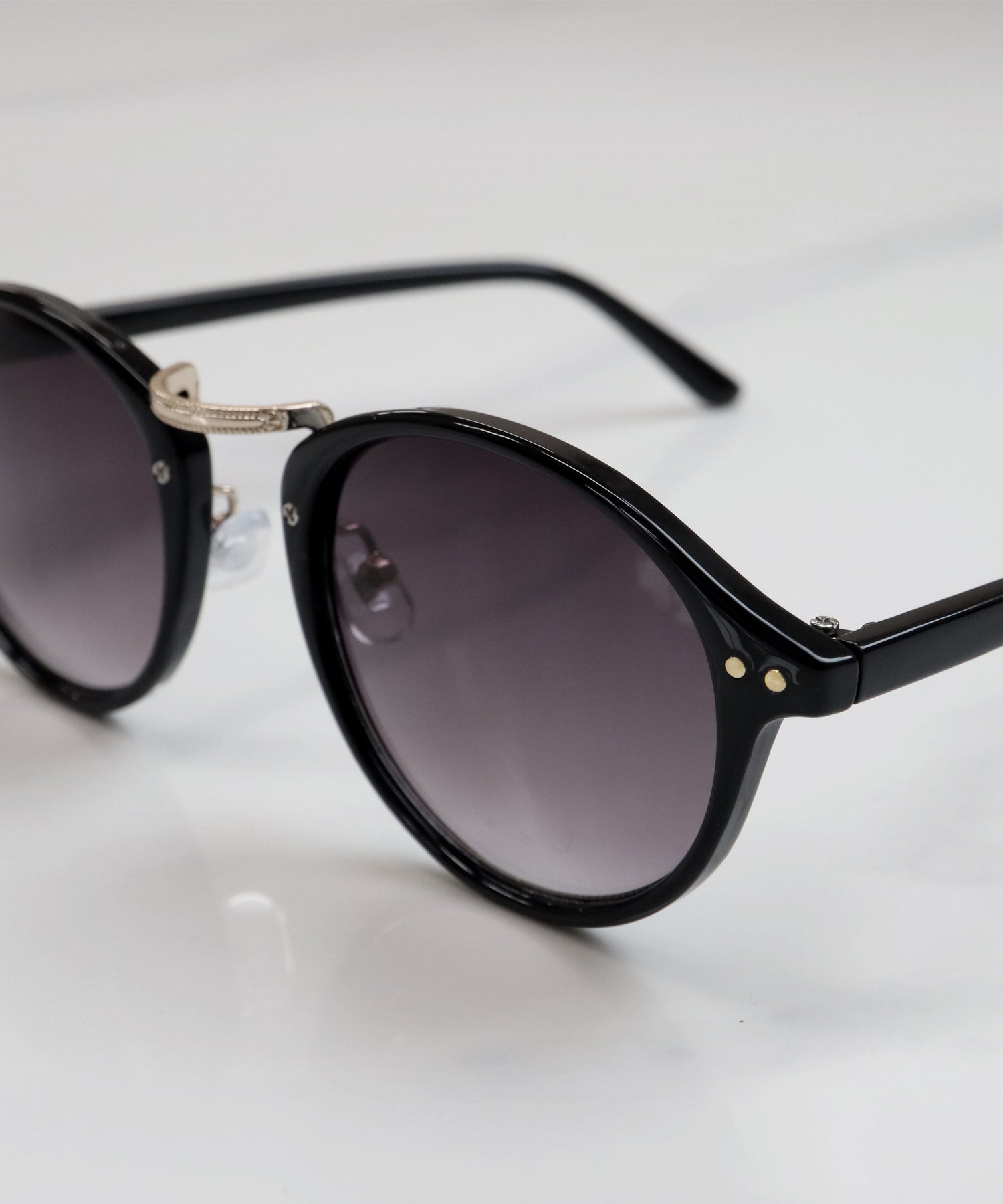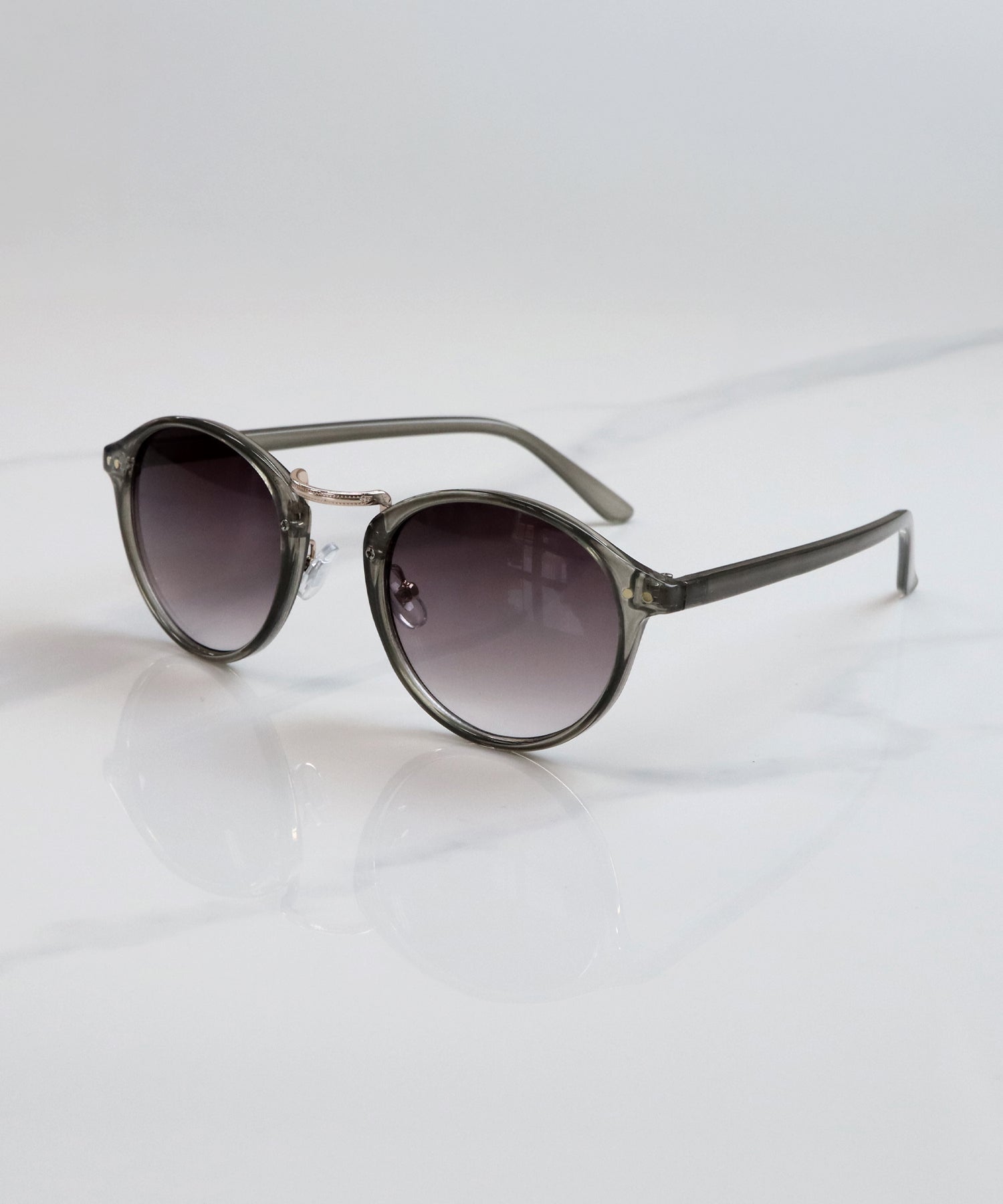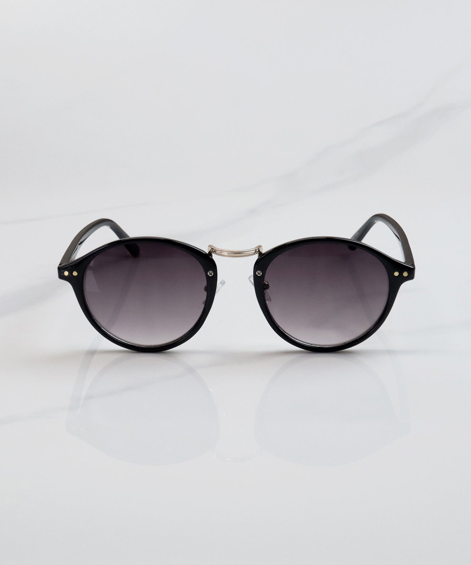 丸みを帯びたボストン型のフレームと、中央のメタルブリッジが特徴的なクラシックなデザインのサングラスです。