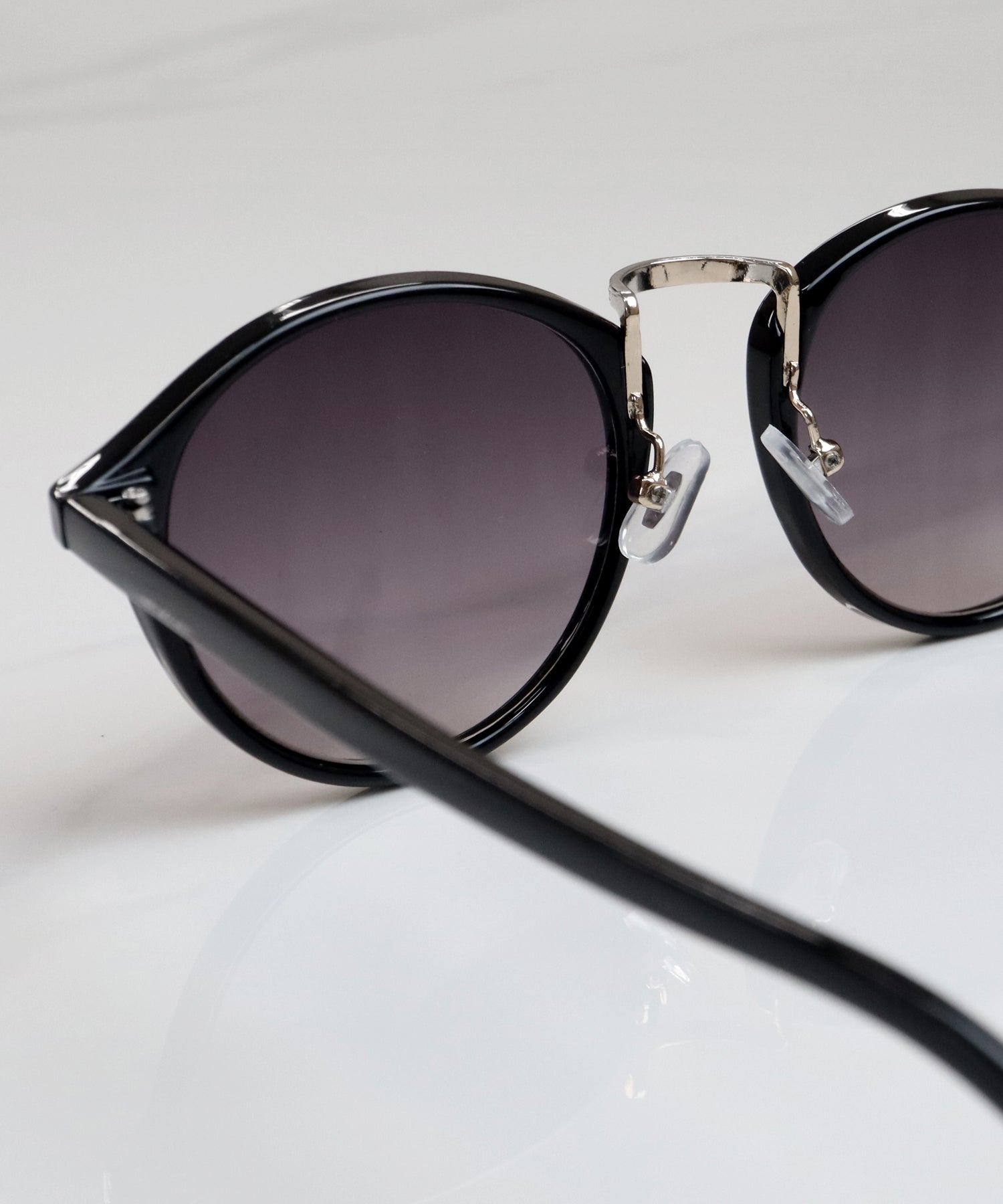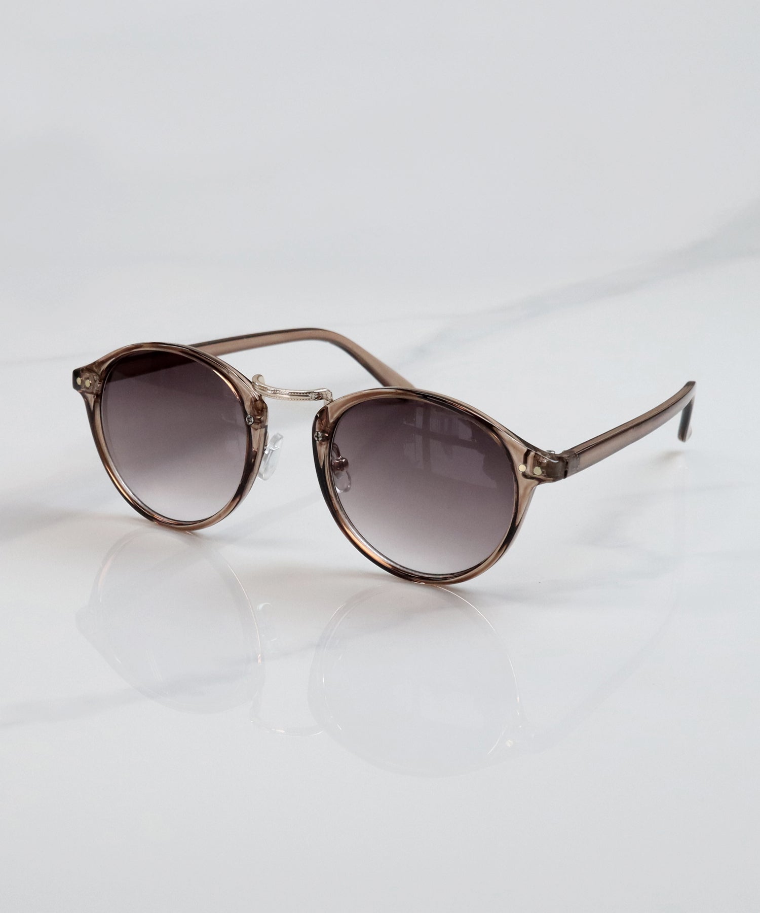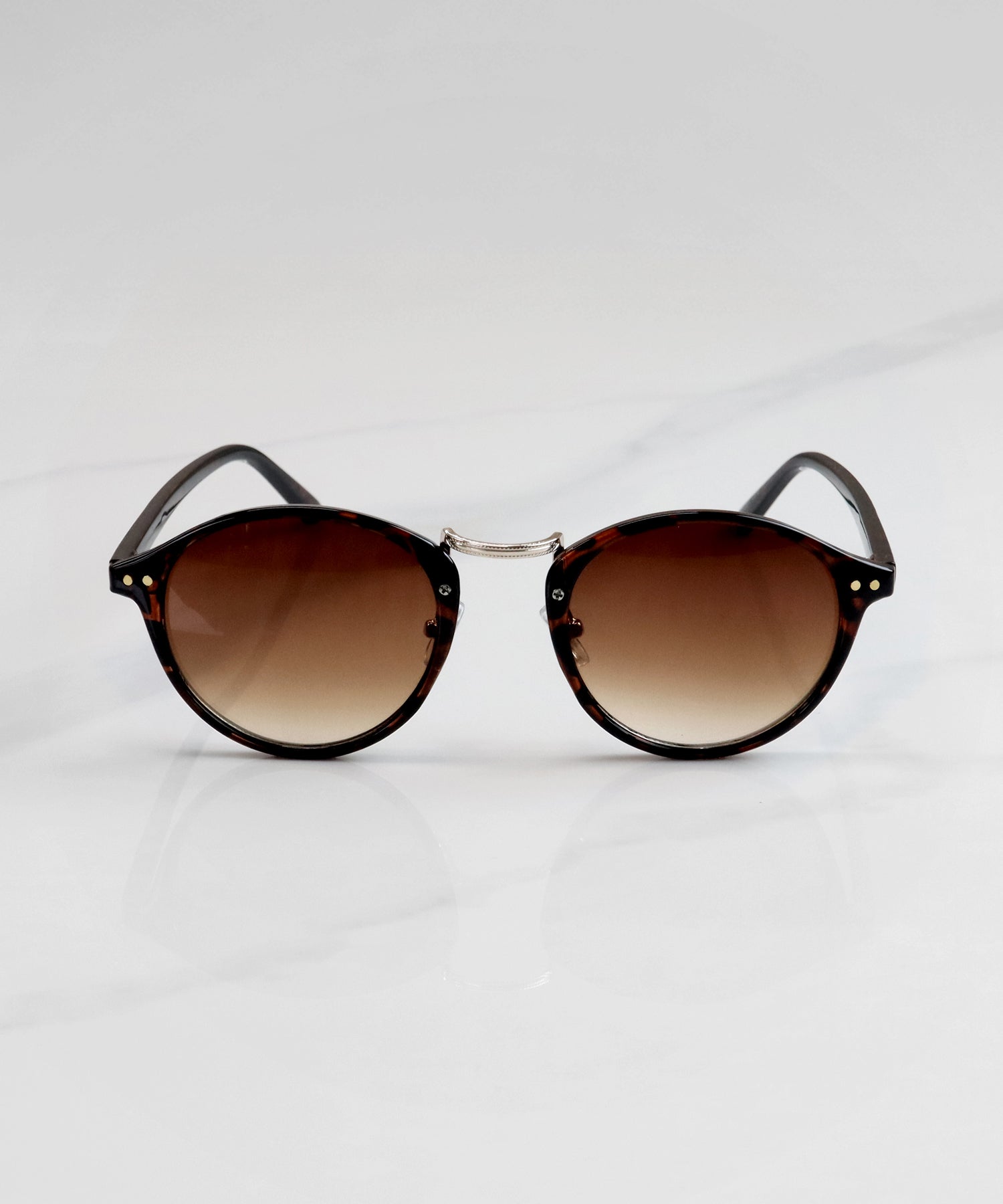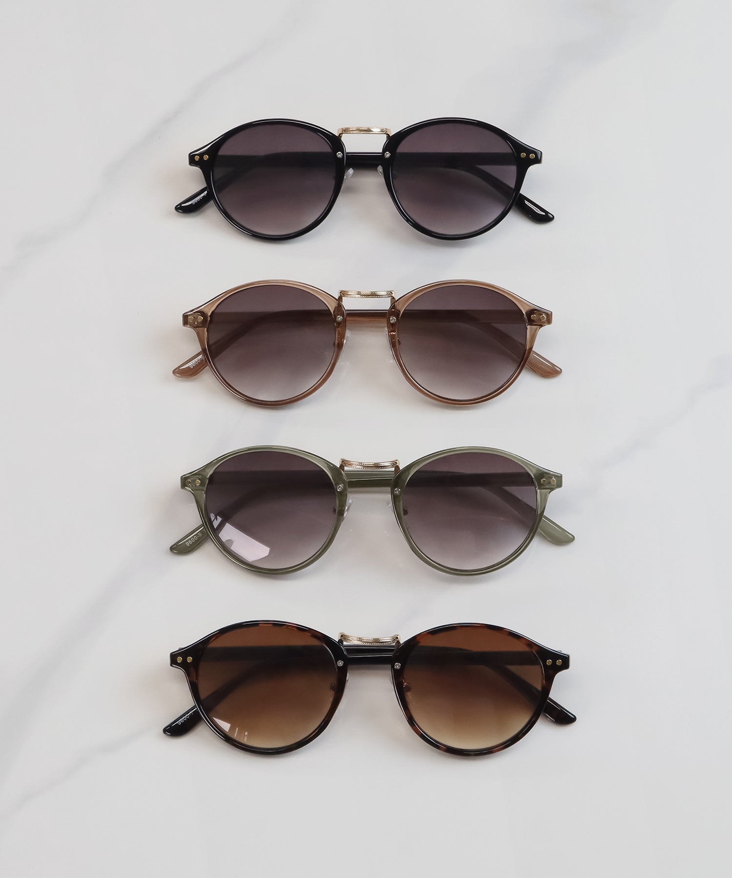 丸みを帯びたボストン型のフレームと、中央のメタルブリッジが特徴的なクラシックなデザインのサングラスです。